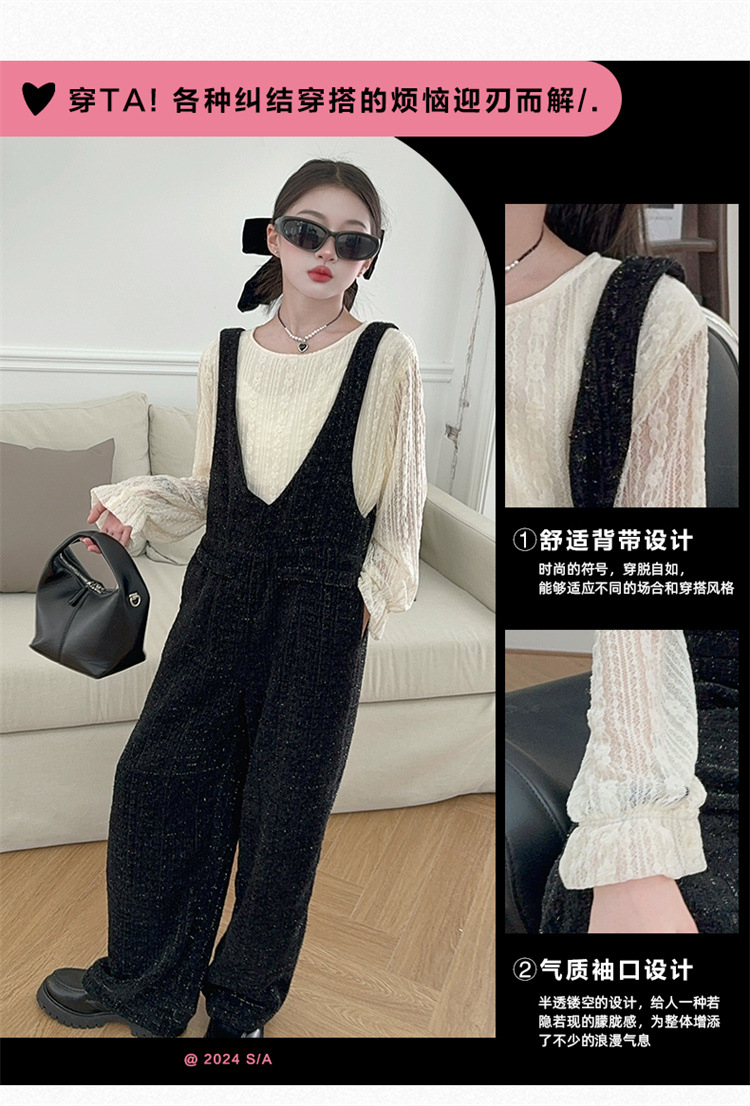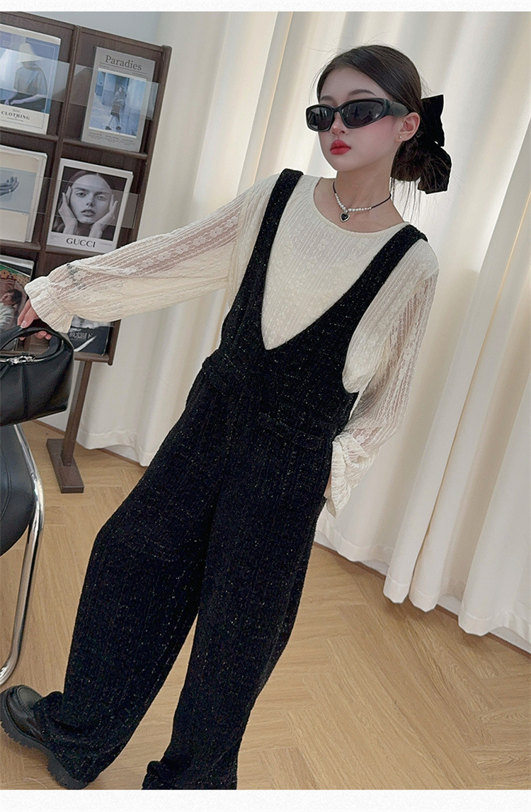 소녀의 게으른 스타일 스트랩 세트 어린이 트위드 바지 레트로 바지 레이스베이스 셔츠 투피스 세트