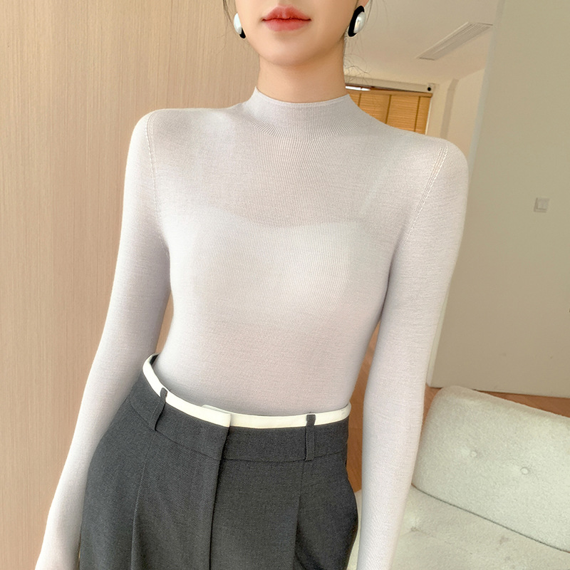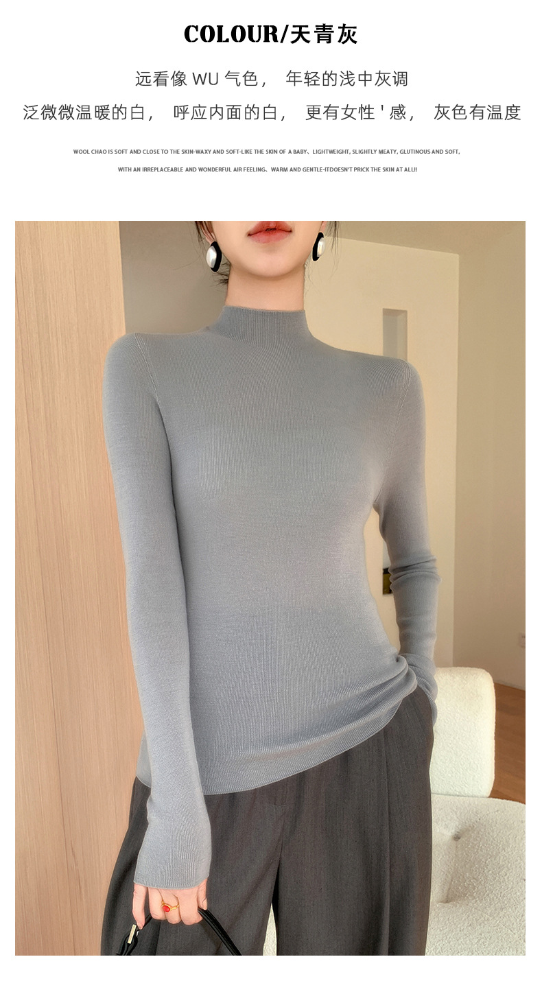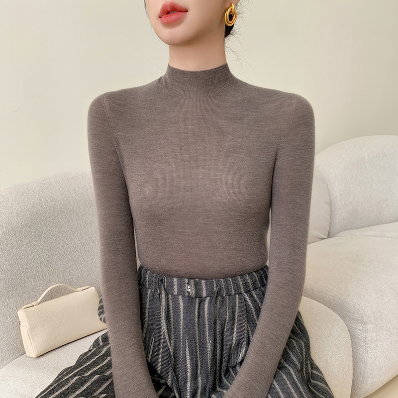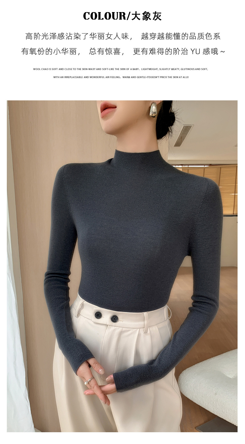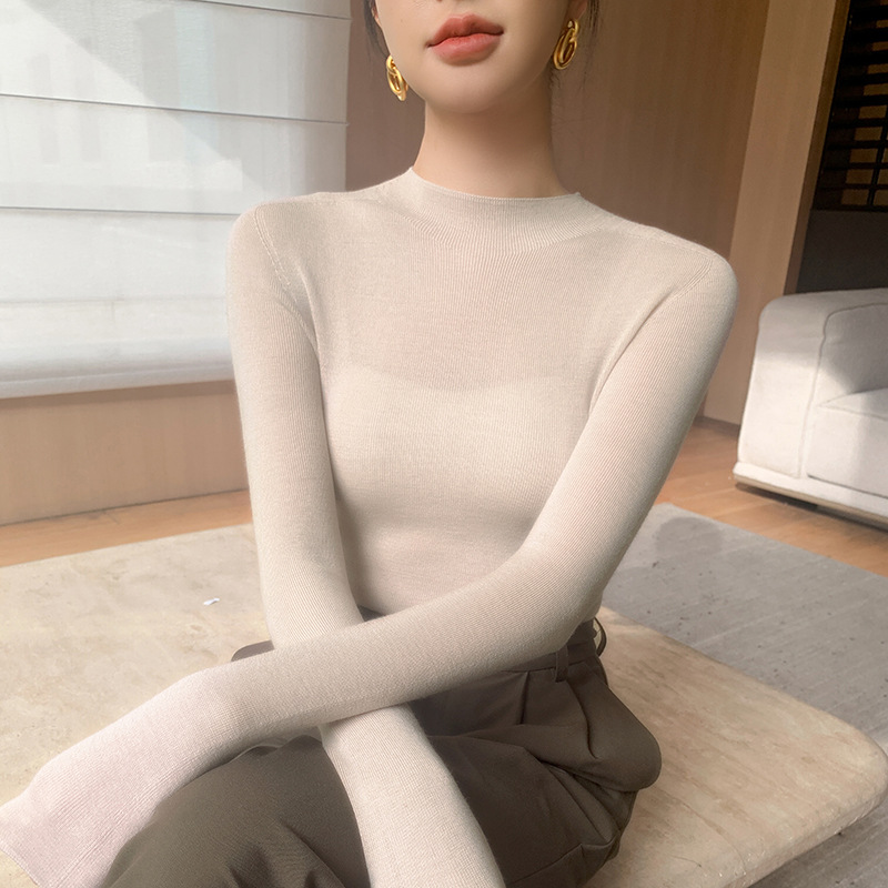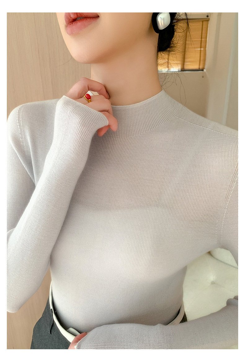 2025 봄과 가을 새로운 반 높은 칼라 순수 양모 니트웨어 여성용 슬림핏 슬리밍 스웨터 심플베이스 셔츠 탑스토어 가기