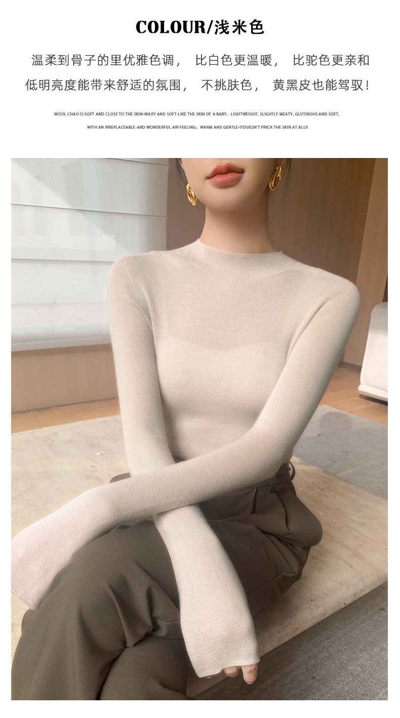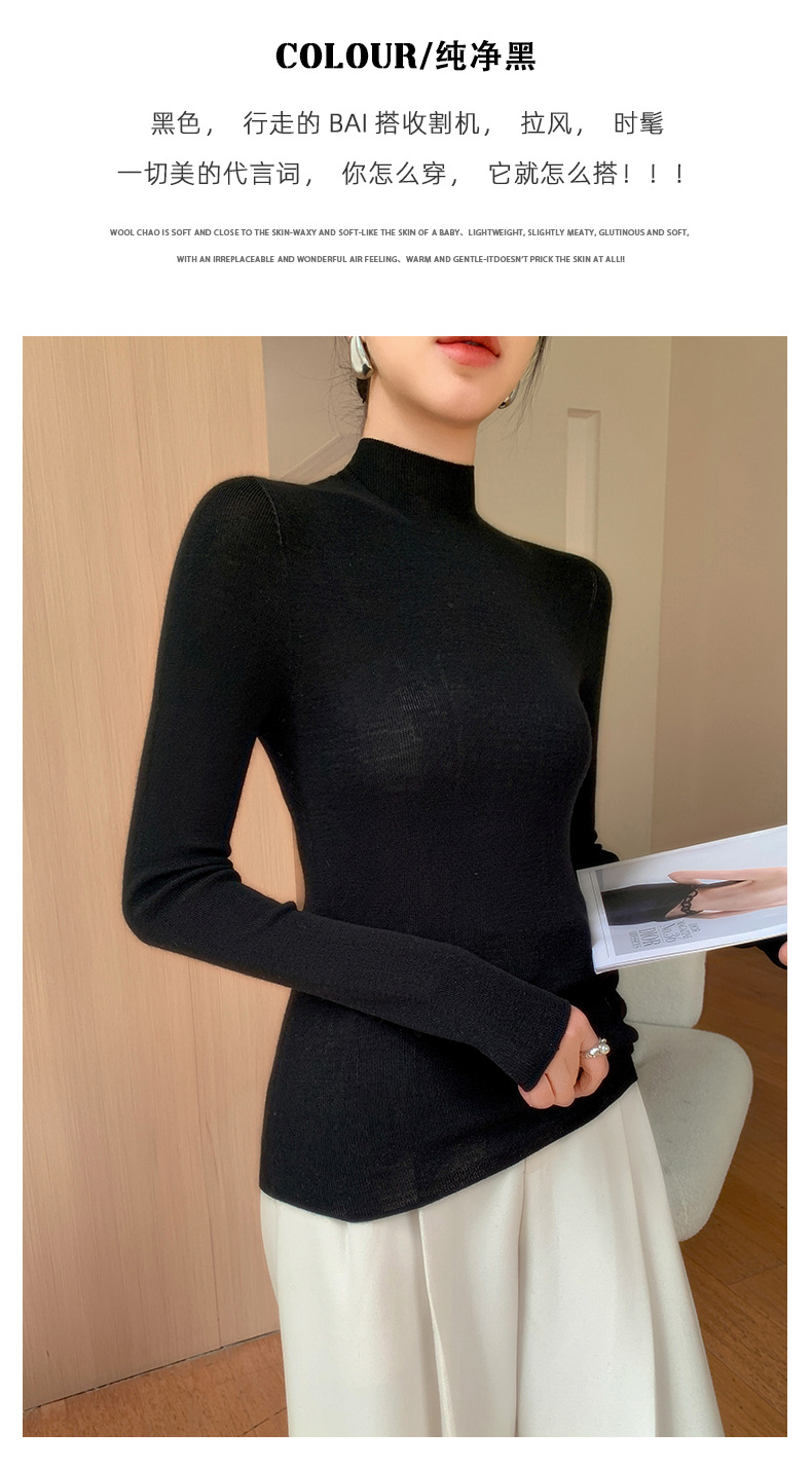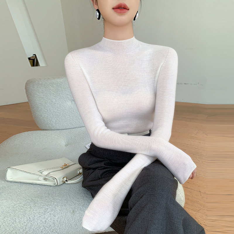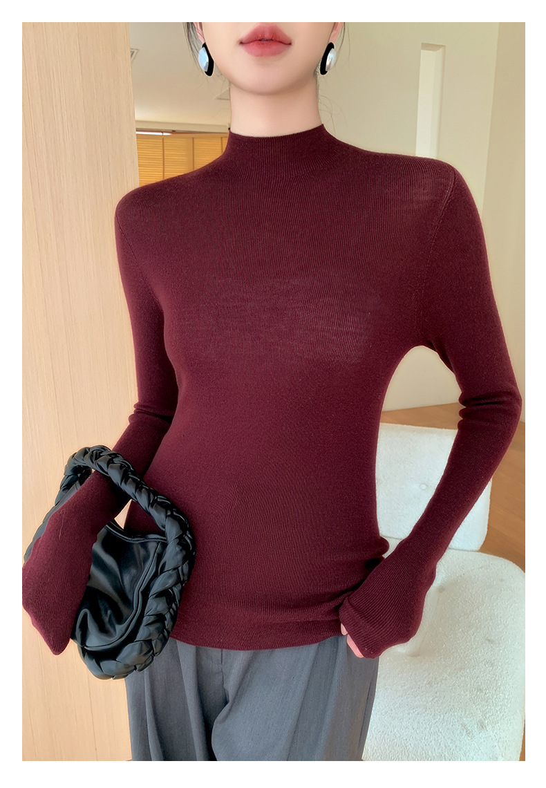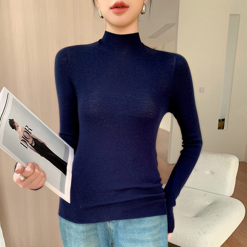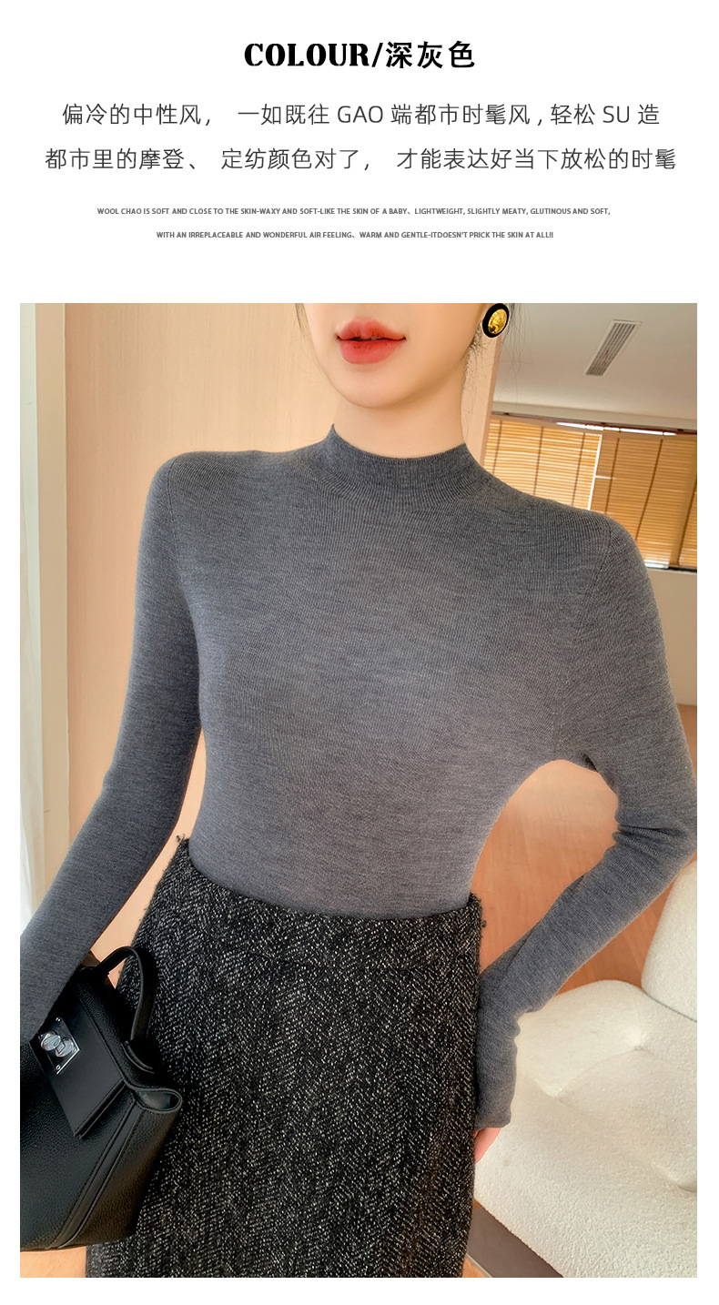 2025 봄과 가을 새로운 반 높은 칼라 순수 양모 니트웨어 여성용 슬림핏 슬리밍 스웨터 심플베이스 셔츠 탑스토어 가기