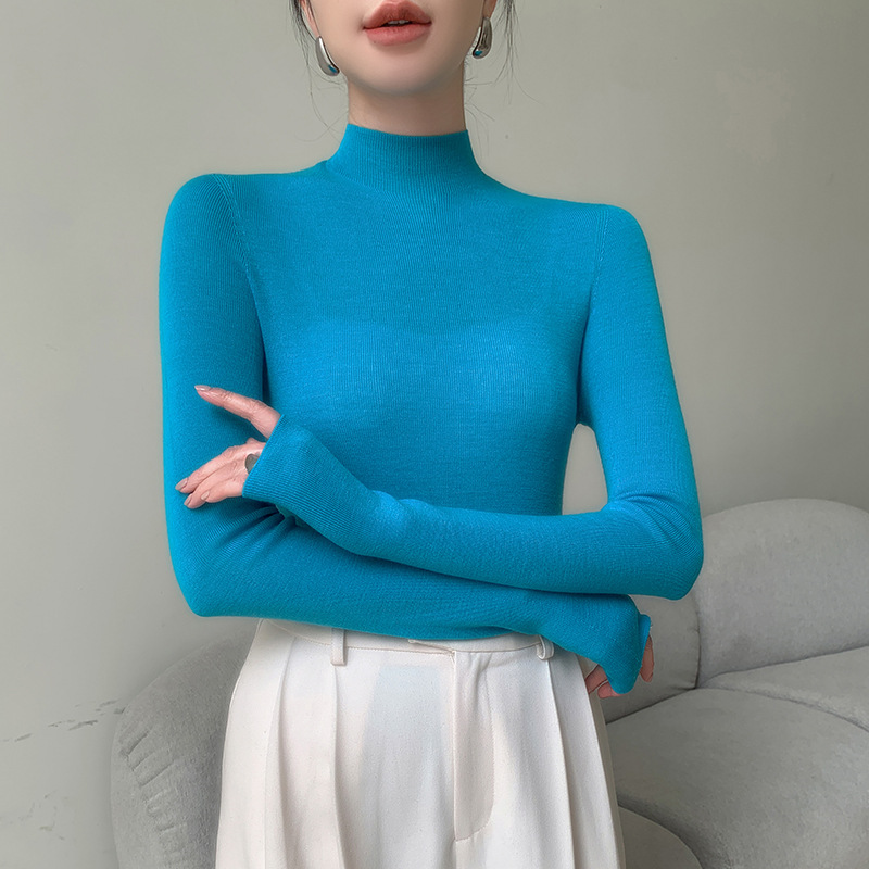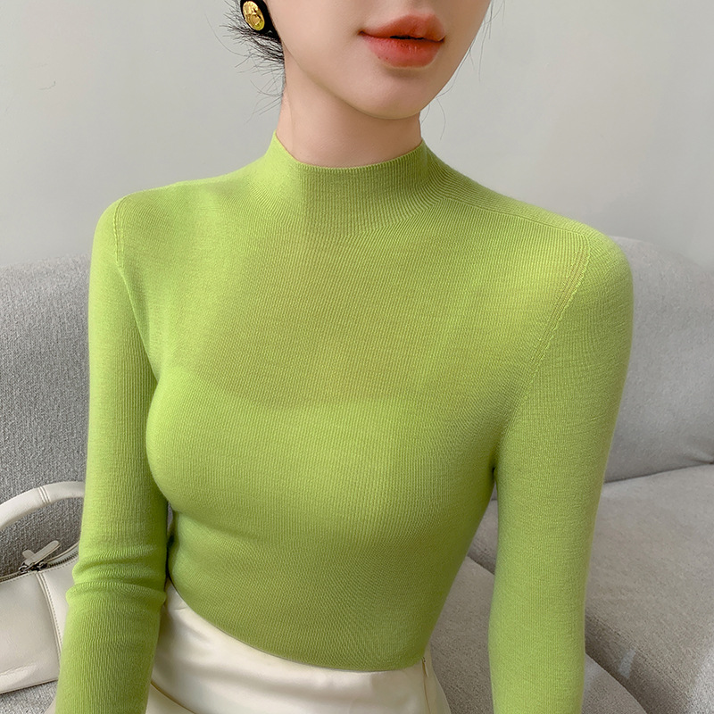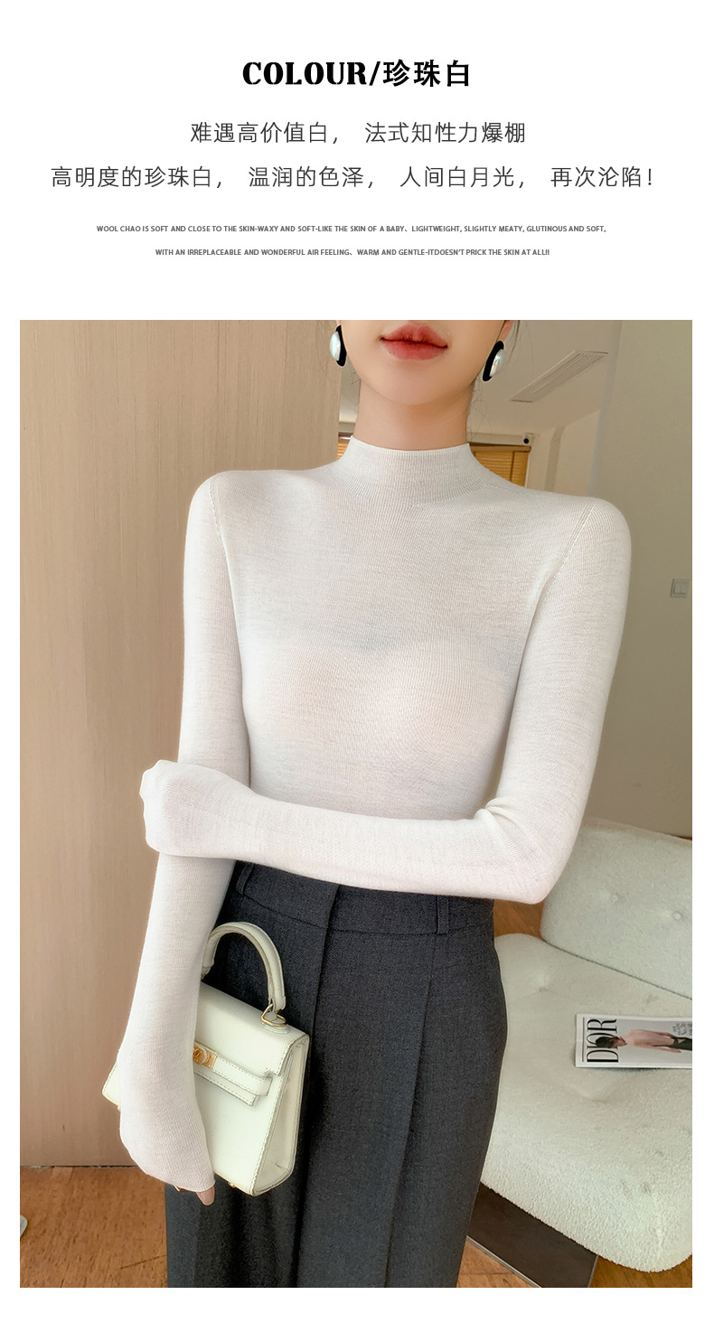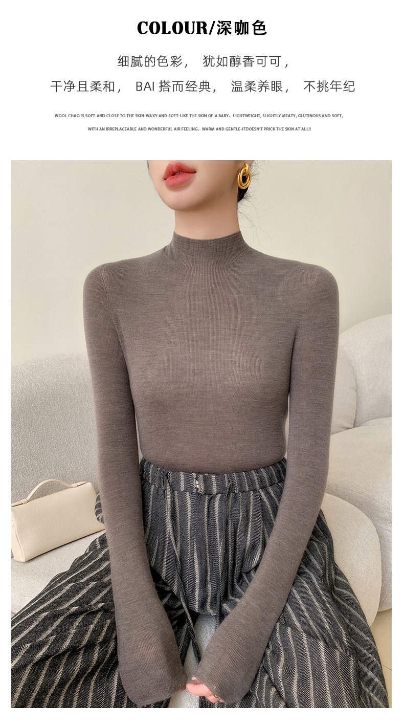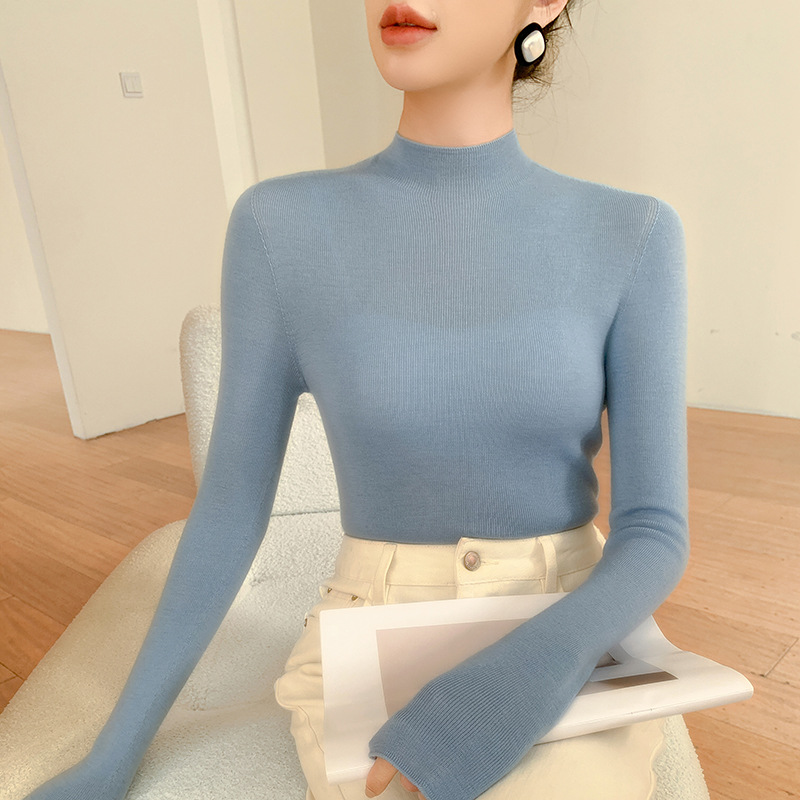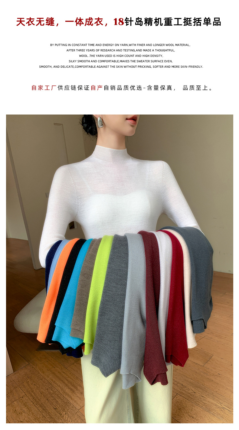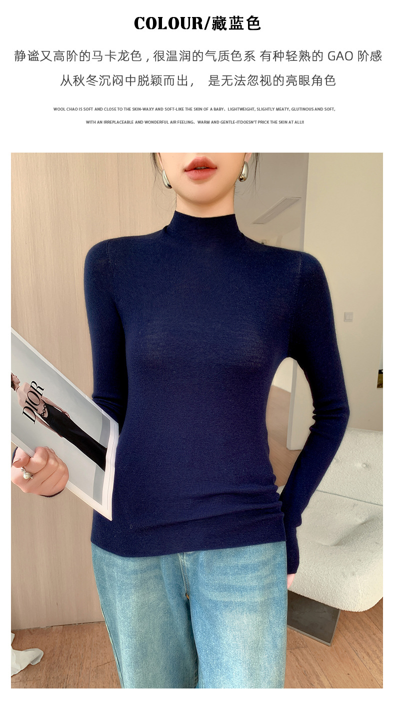 2025 봄과 가을 새로운 반 높은 칼라 순수 양모 니트웨어 여성용 슬림핏 슬리밍 스웨터 심플베이스 셔츠 탑스토어 가기