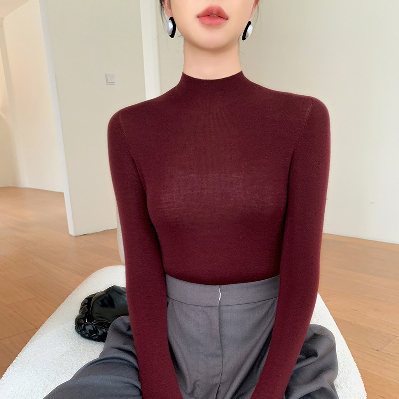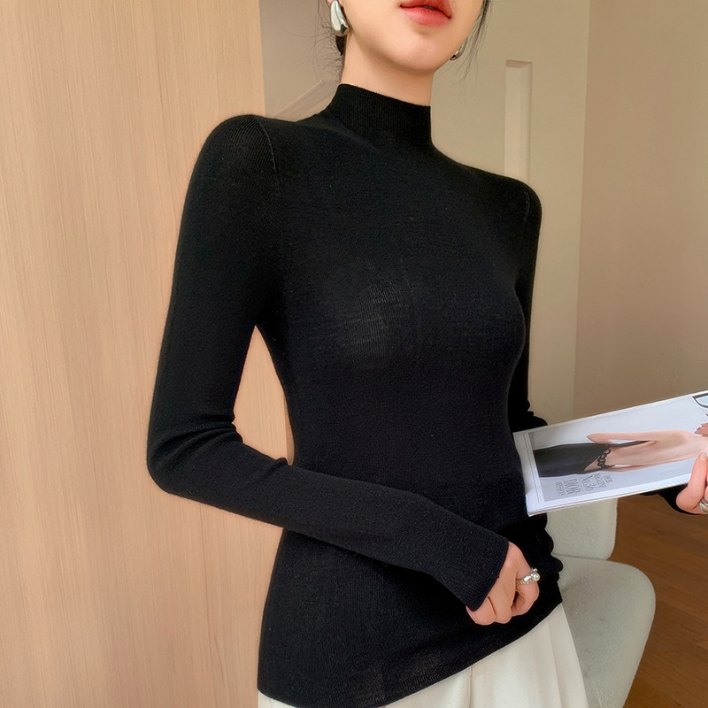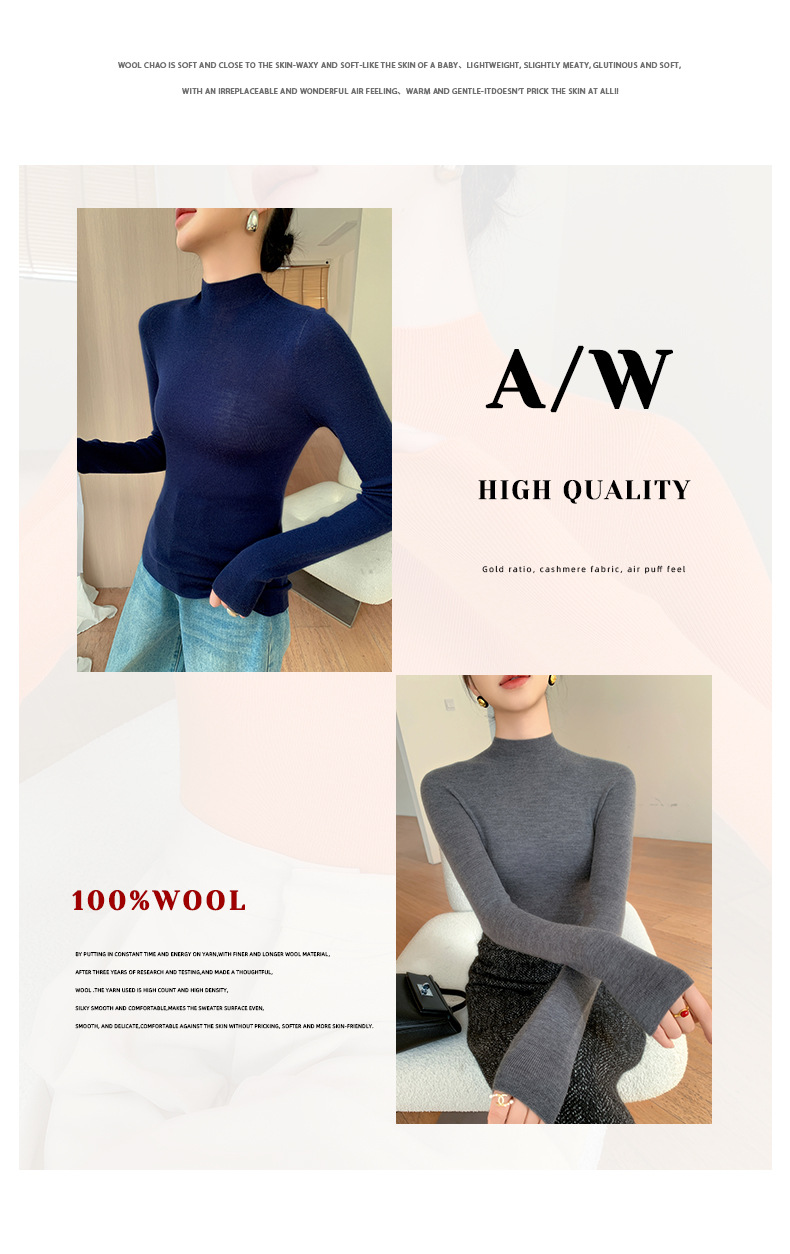 2025 봄과 가을 새로운 반 높은 칼라 순수 양모 니트웨어 여성용 슬림핏 슬리밍 스웨터 심플베이스 셔츠 탑