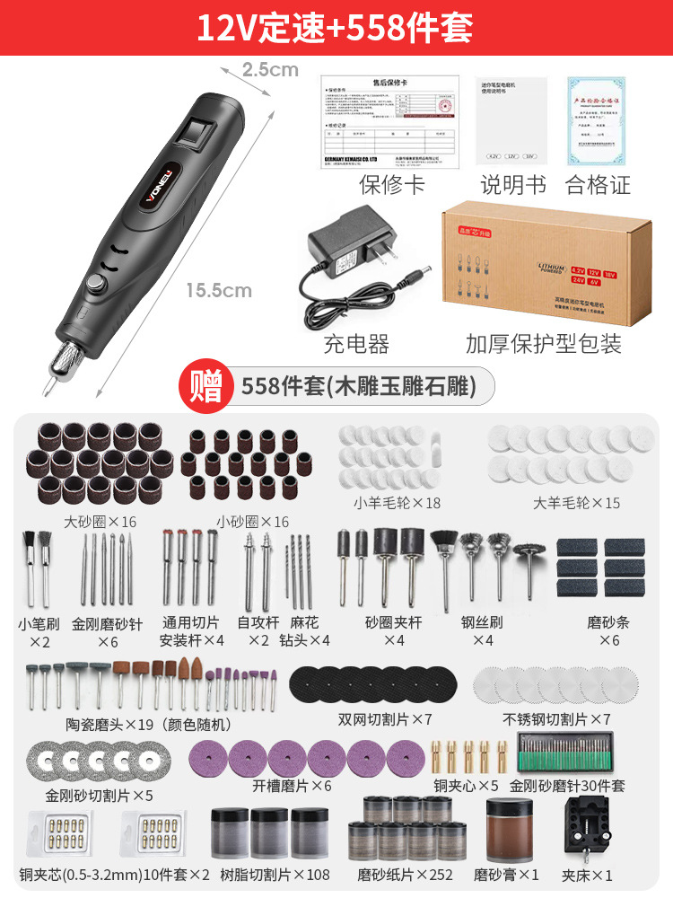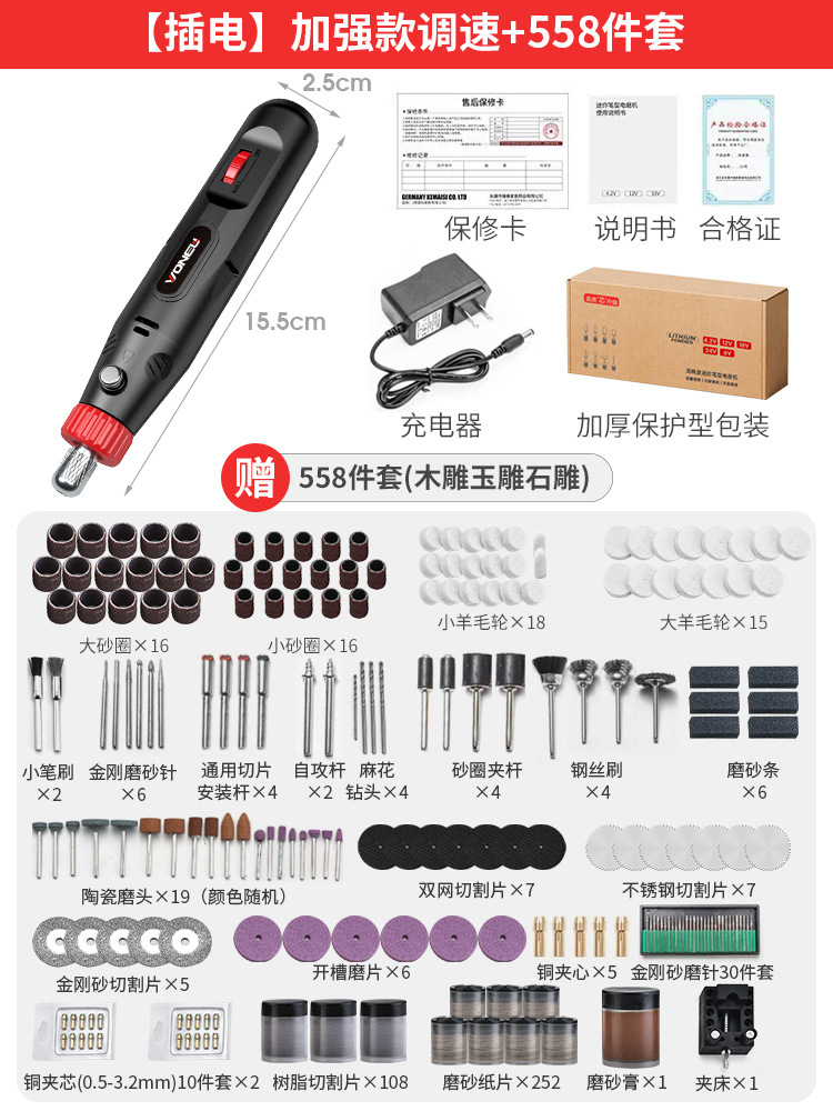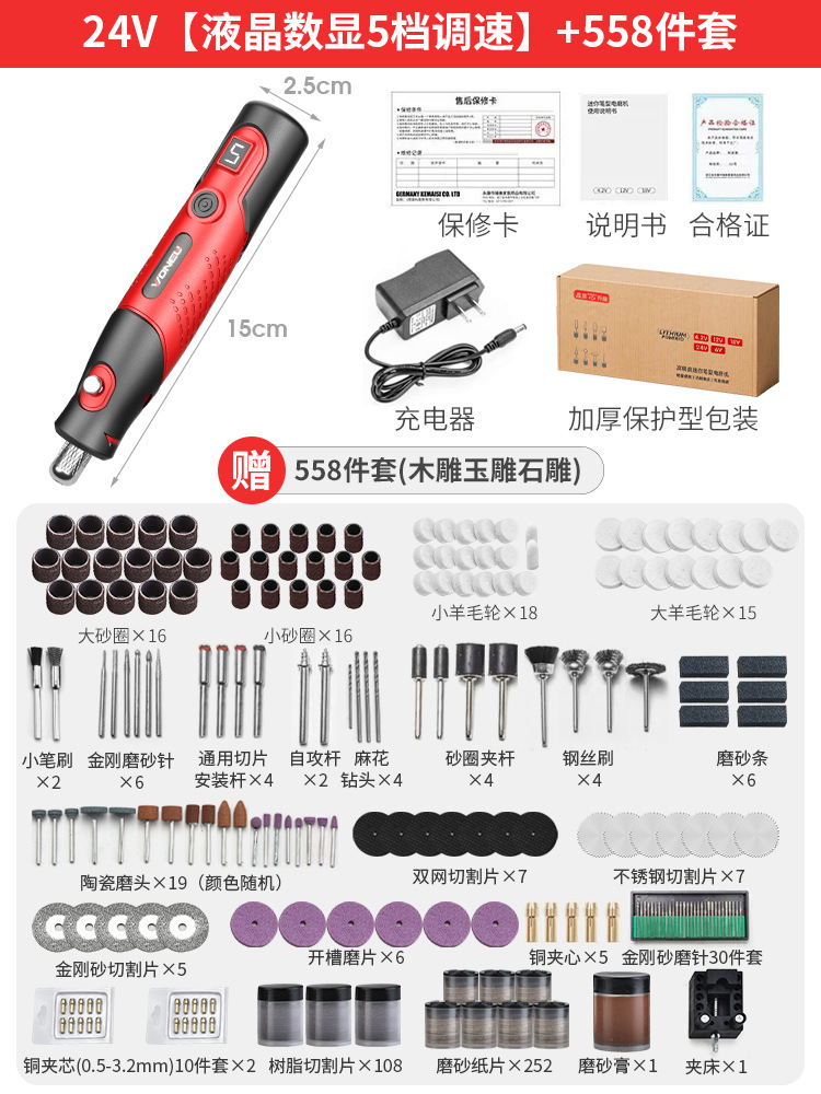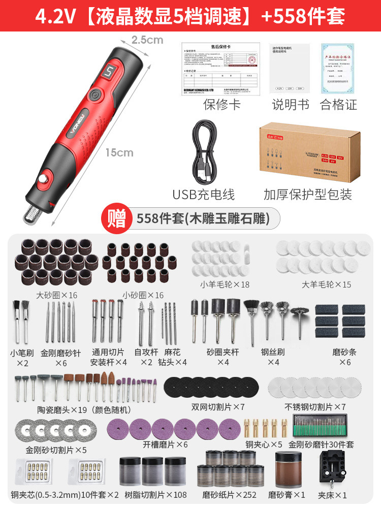 • 4.2V 충전식 모델 [LCD 디지털 디스플레이 5단 속도 조절] + 558개 세트(목각/심각/옥각/석각)