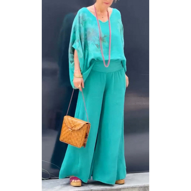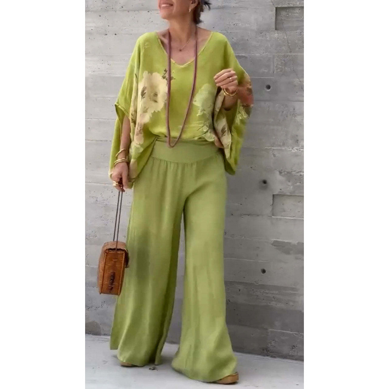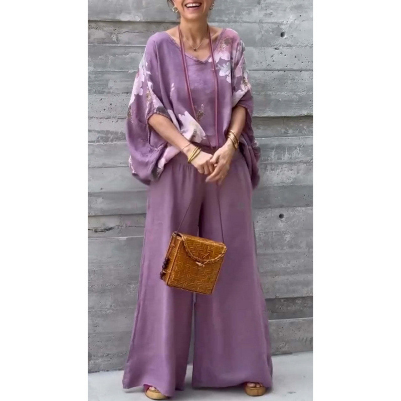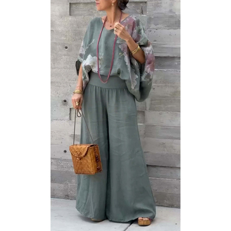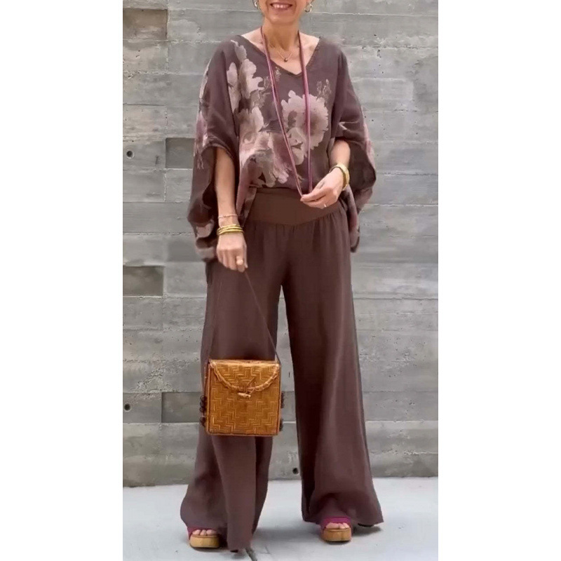 2025 새로운 유럽 및 미국 여성 국경 독립 역 폭발 여성 V 넥 코튼 및 리넨 인쇄 재킷 바지 캐주얼 세트