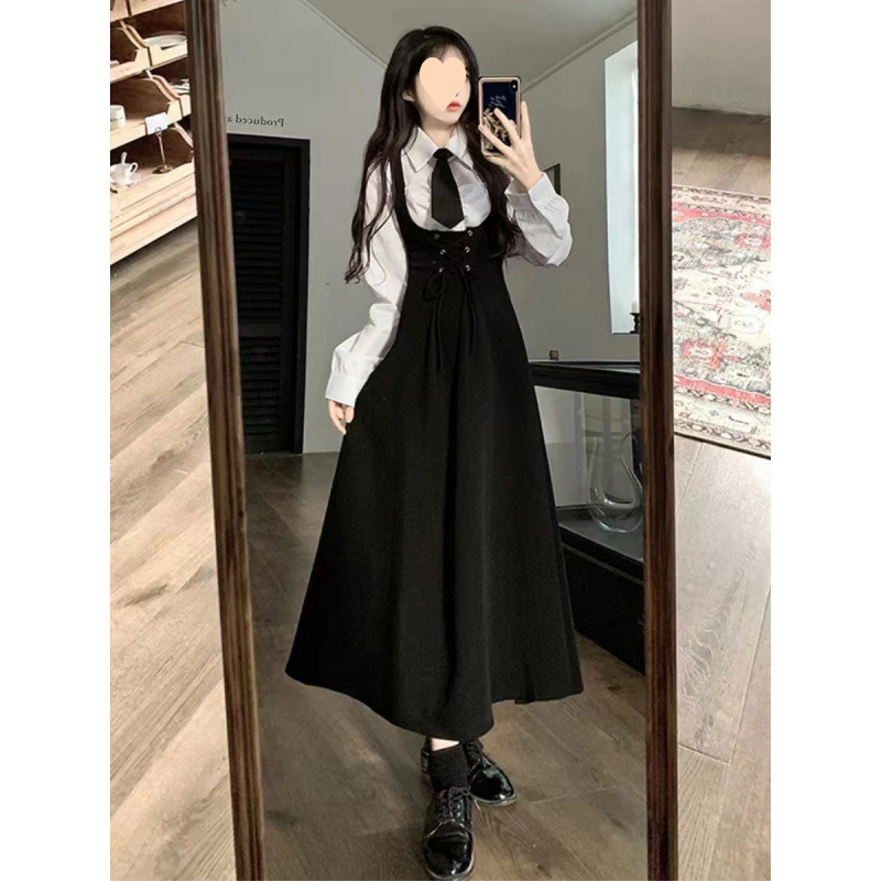 일본식 대학 스타일 레이스 업 허리 중간 길이 스트랩 원피스 여성 봄 가을 한국 스타일 학생 셔츠 원피스 세트스토어 가기