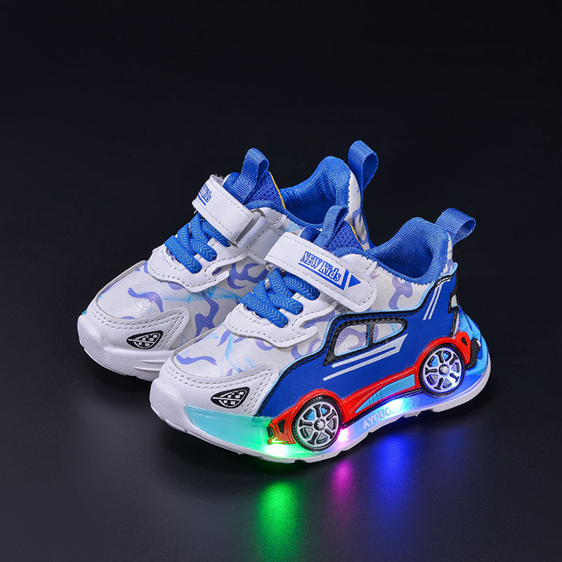 빛나는 운동화 2025 봄과 가을 새로운 만화 자동차 어린이 캐주얼 신발 작은 소년의 가죽 라이트 업 신발스토어 가기