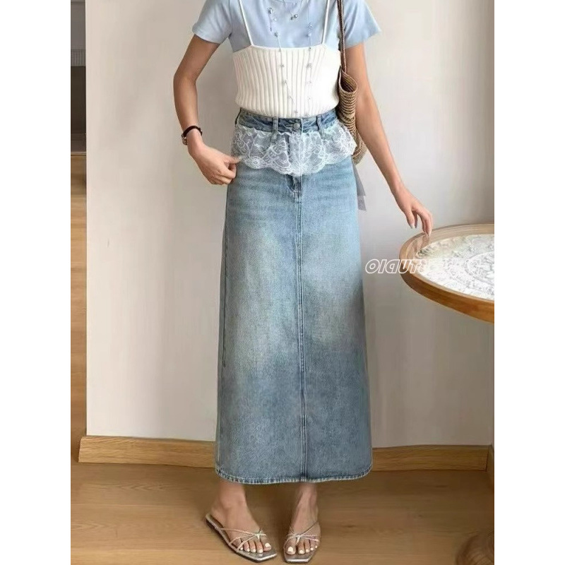 프랑스 스타일 레이스 바느질 데님 스커트 여성 봄 새로운 패션 우아한 단어 긴 치마 2025스토어 가기