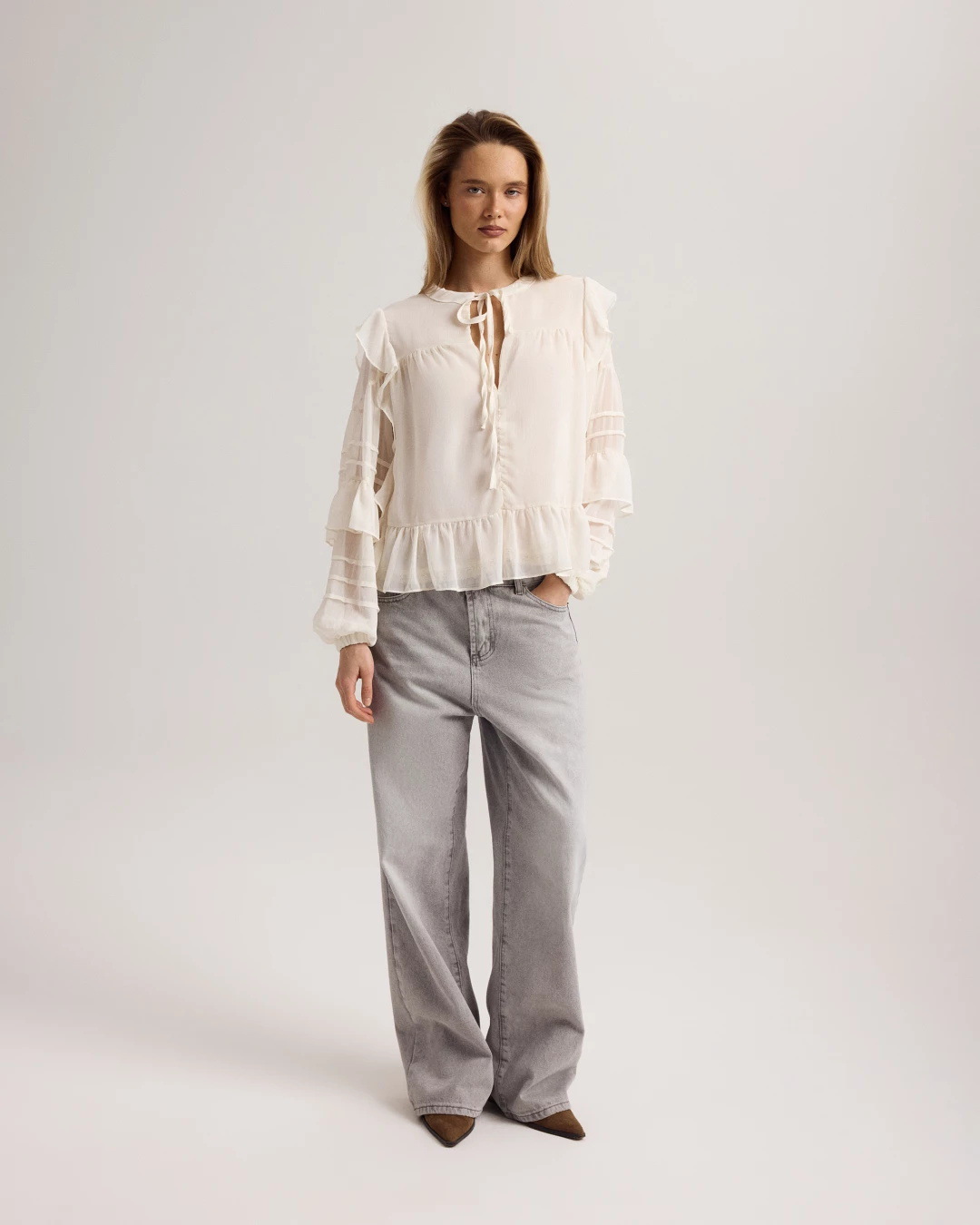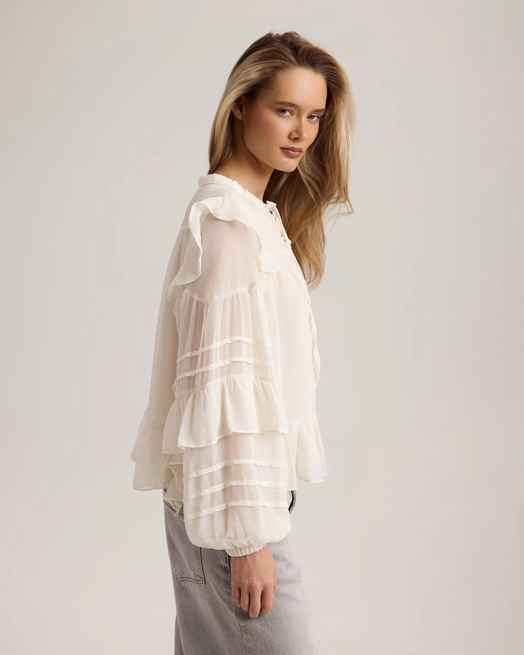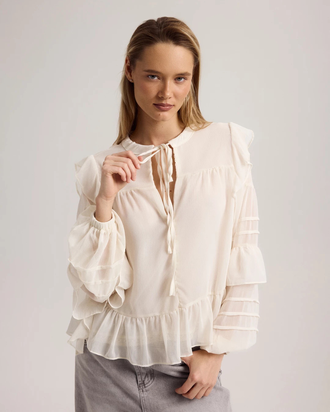 봄과 여름 2025 새로운 프랑스 스타일 레트로 러플 레이스 업 쉬폰 셔츠 여성의 통기성 우아한 통근 요정 셔츠