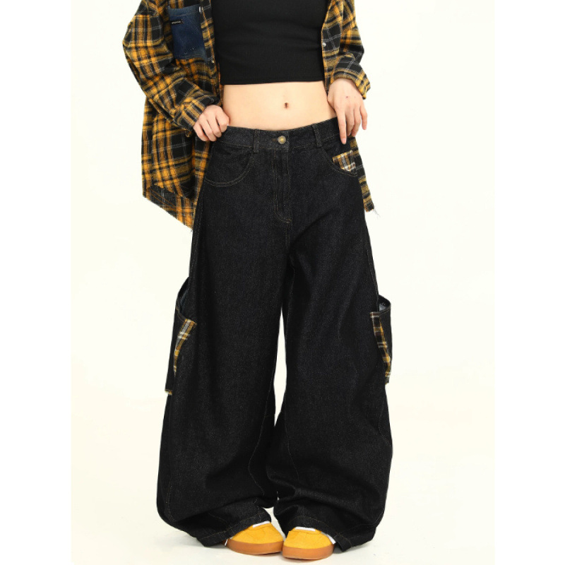미국 스타일 복고풍 격자 무늬 바느질 만화 시미타르 청바지 여성의 2025 봄 느슨한 와이드 레그 멀티 포켓 작업 바지