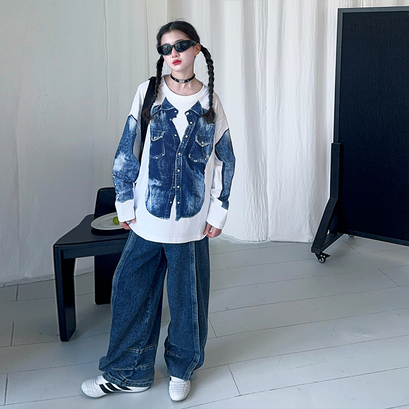 소녀 2025 세트 봄과 가을 새로운 한국 스타일 어린이 빅 보이 프린트 긴 소매 티셔츠 청바지 투피스 유행 세트