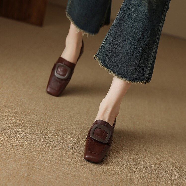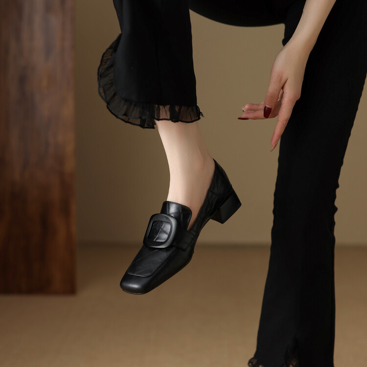 프랑스 스타일 우아한 레트로 레푸 작은 가죽 신발 영국 스타일 두꺼운 발 뒤꿈치 슬립 온 편안한 깊은 입 스퀘어 버클 싱글 레이어 신발스토어 가기