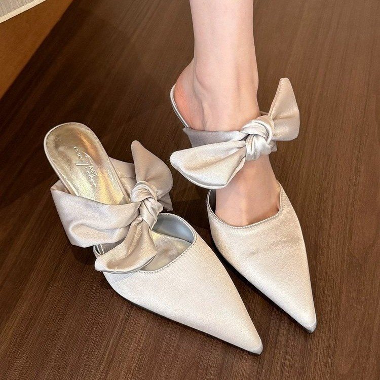 새틴 활 뾰족한 스틸레토 힐 하이힐 2025 새로운 패션 바오터우 뮬 신발 봄과 여름스토어 가기