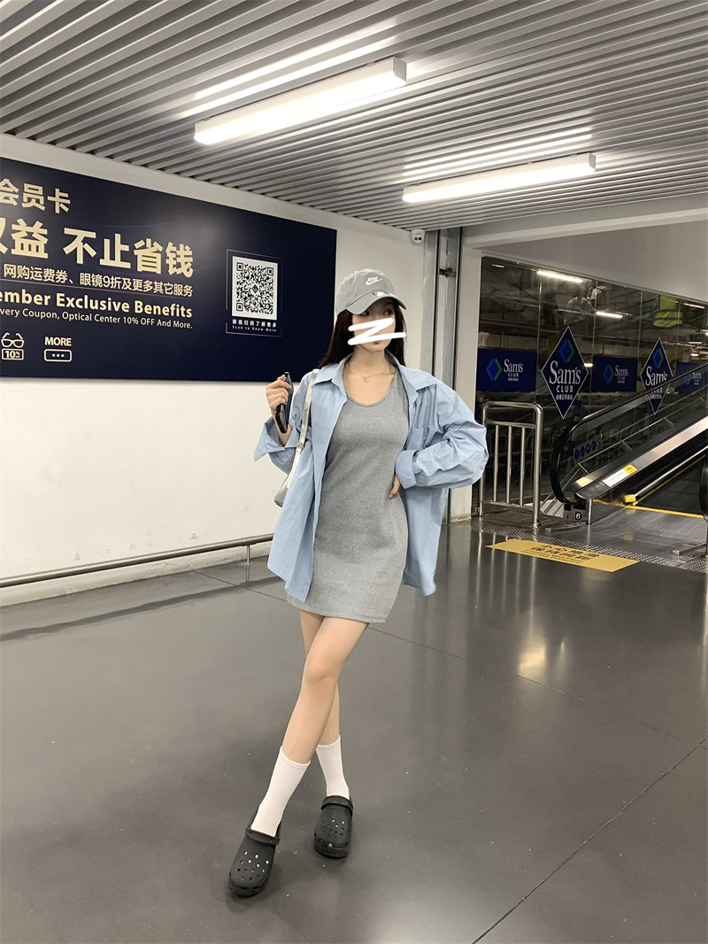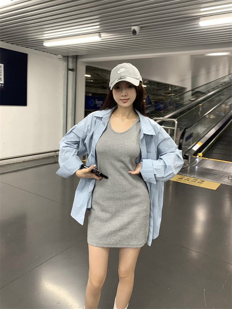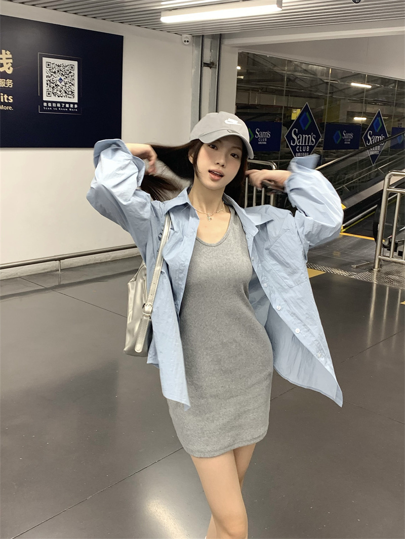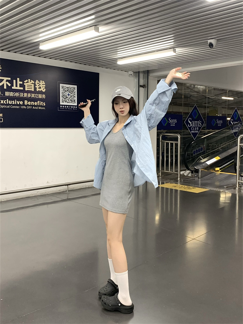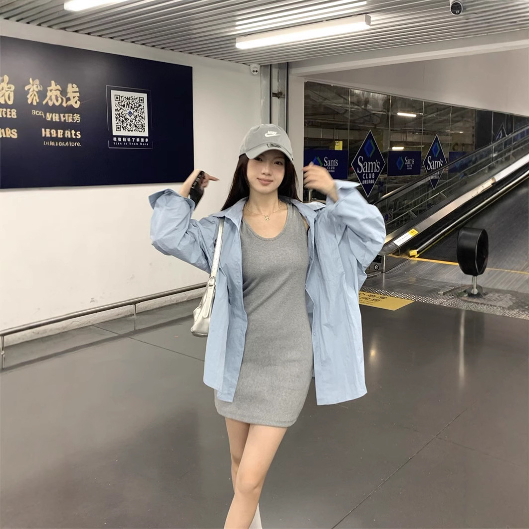 재고 리얼 샷 ~ 블루 아일랜드 게으른 조커 느슨한 긴팔 셔츠 슬림 v-neck 조끼 원피스 77883