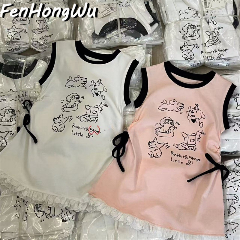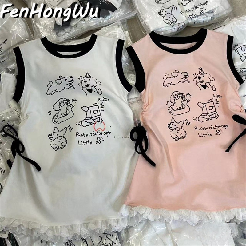 [핑크 집] 아동복 아기 귀여운 강아지 프린트 조끼 치마 달콤한 레이스 소녀의 원피스