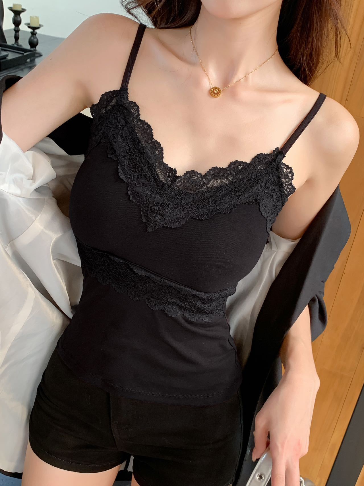 순수한 욕망 스타일 스파이스 소녀 레이스 카미 솔 여성 조끼 가슴 패드 V 넥 민소매 탑 슬리밍베이스 셔츠 국경 폭발스토어 가기