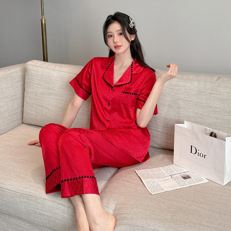 소스 공장 제품 2025 연인 아이스 실크 잠옷 여성 봄과 가을 짧은 소매 플러스 사이즈 옷깃 카디건 세트 그물 레드 라이브