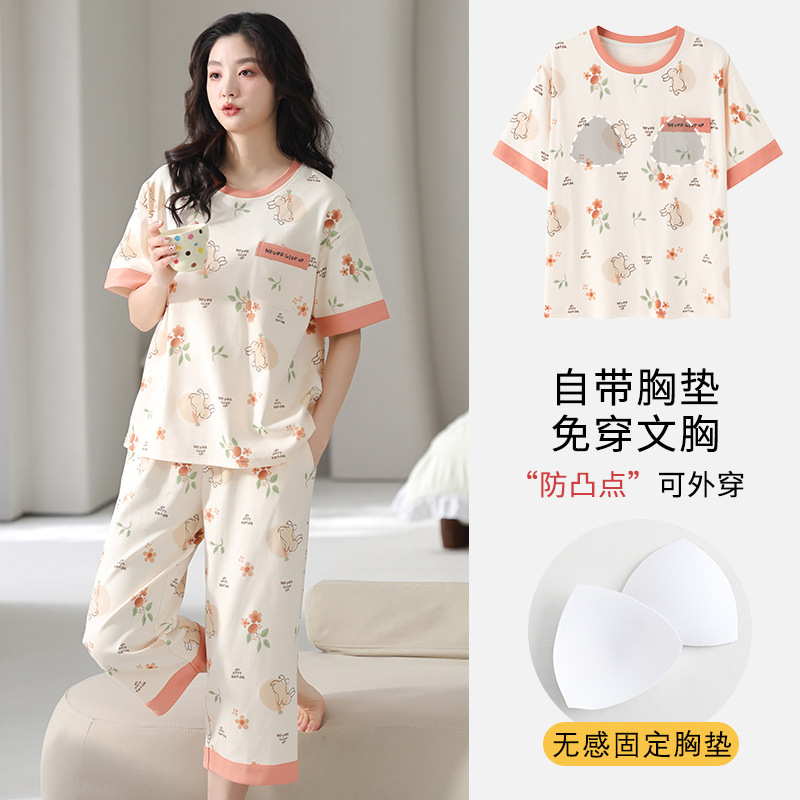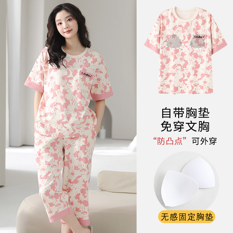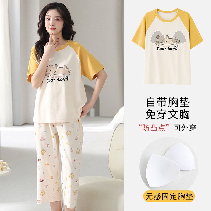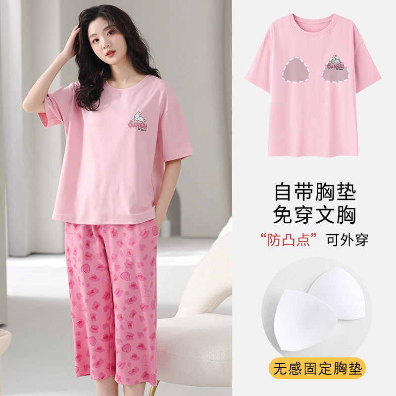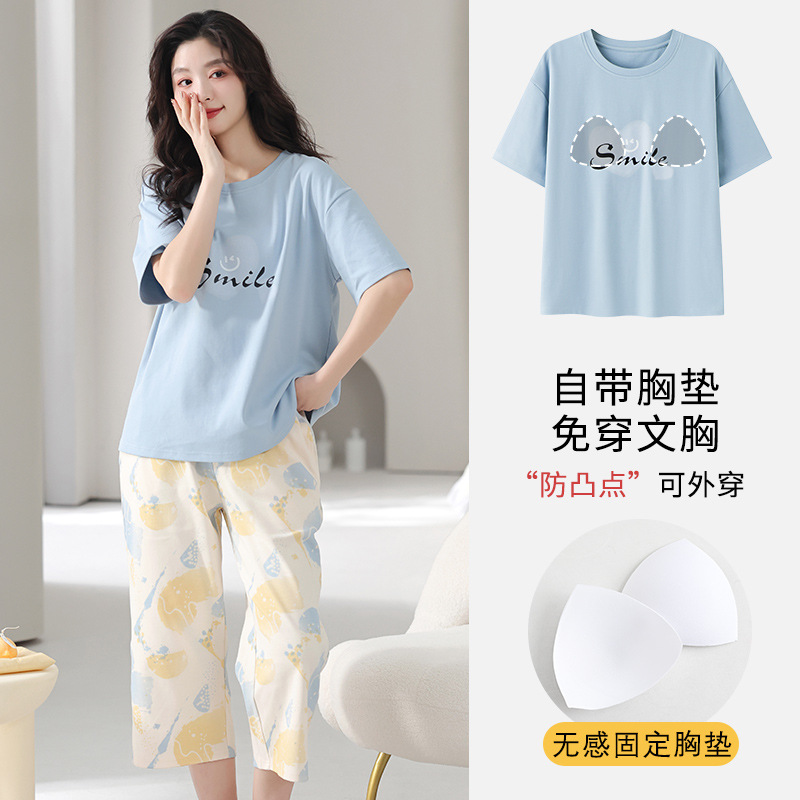 국경 간 여름 모조 면 파자마 세트 가슴 패드 아웃웨어 여성 반팔 카프리 바지 캐주얼 한국식 홈 옷스토어 가기