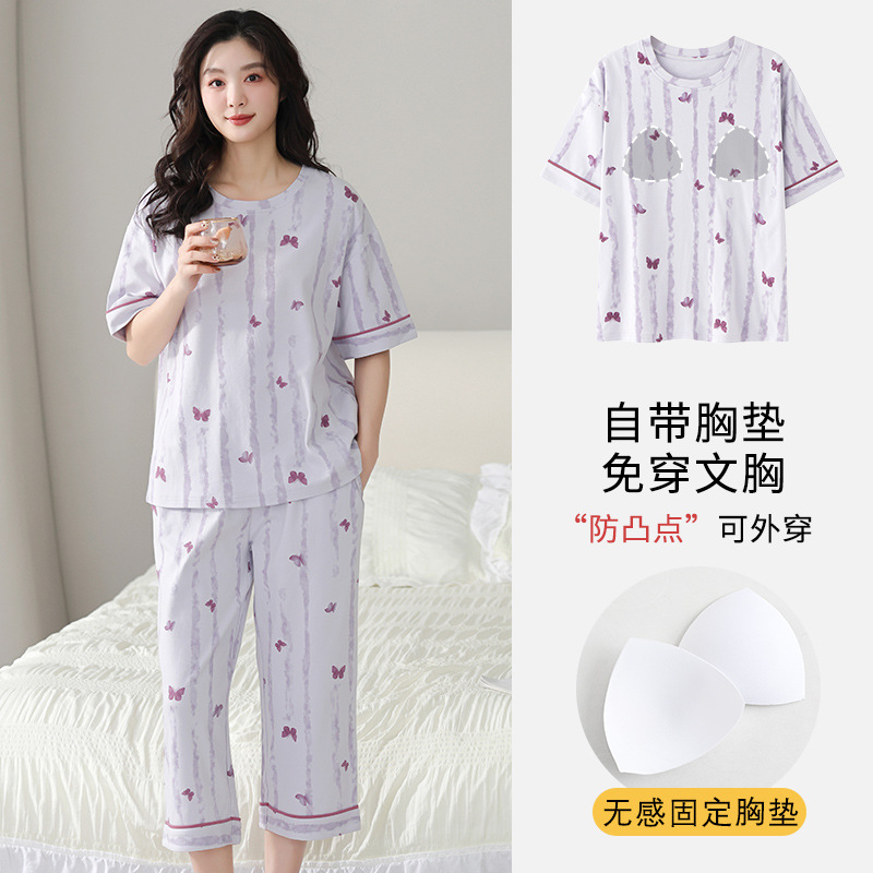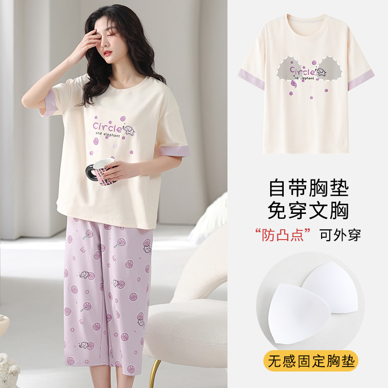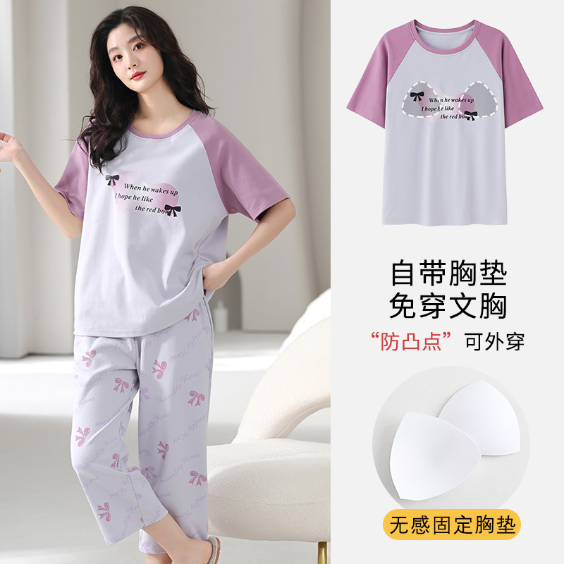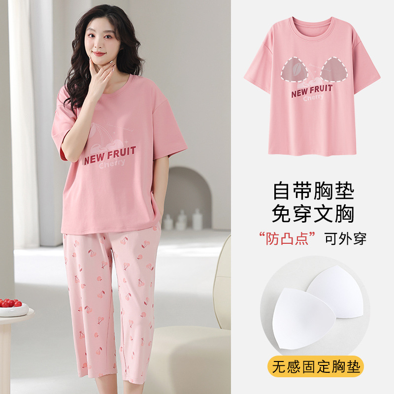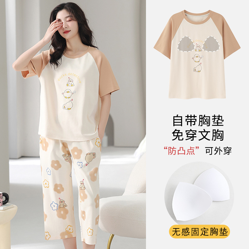 국경 간 여름 모조 면 파자마 세트 가슴 패드 아웃웨어 여성 반팔 카프리 바지 캐주얼 한국식 홈 옷스토어 가기