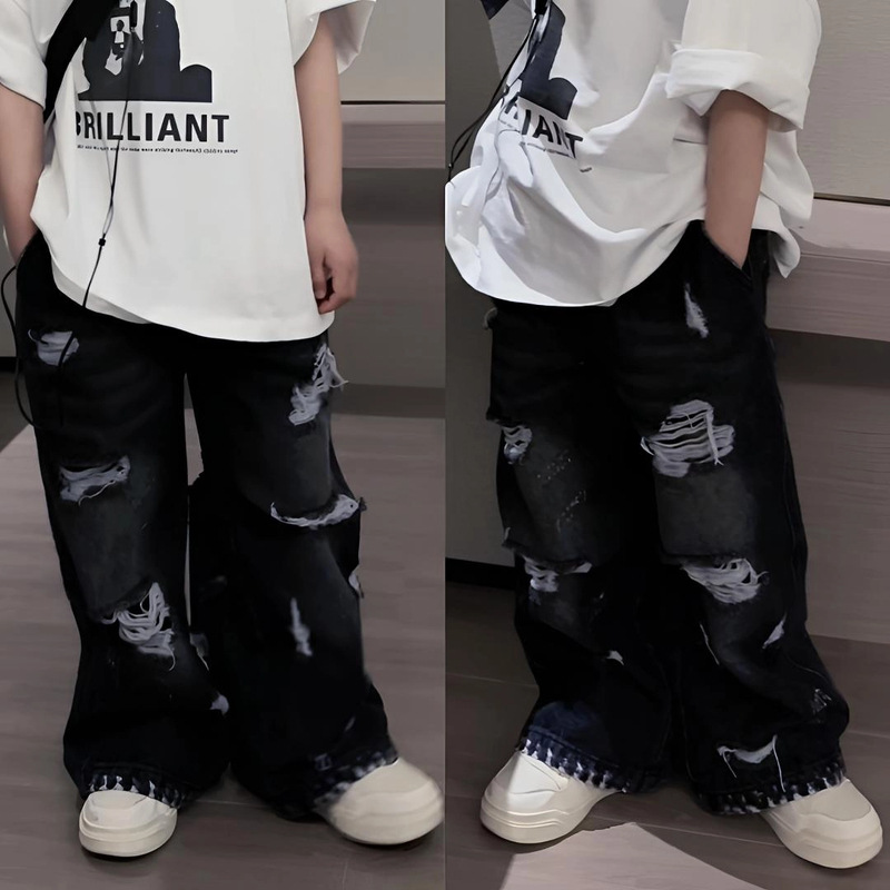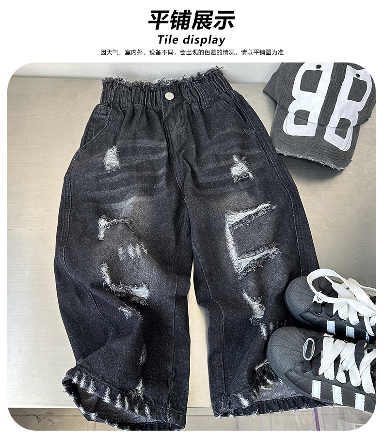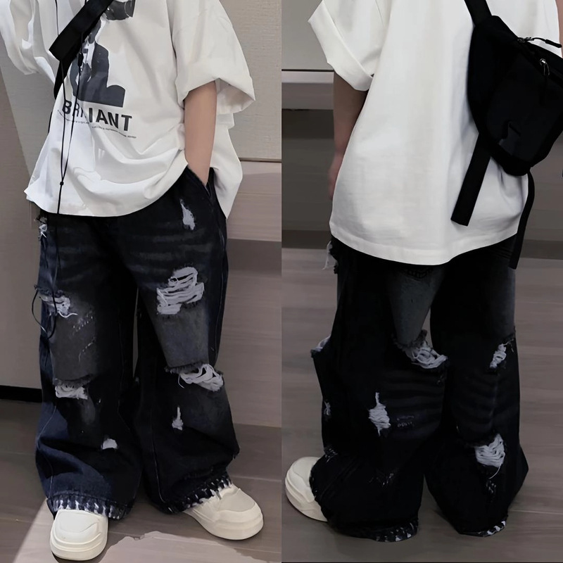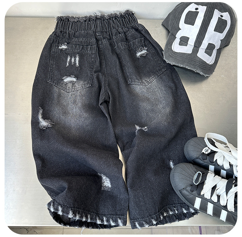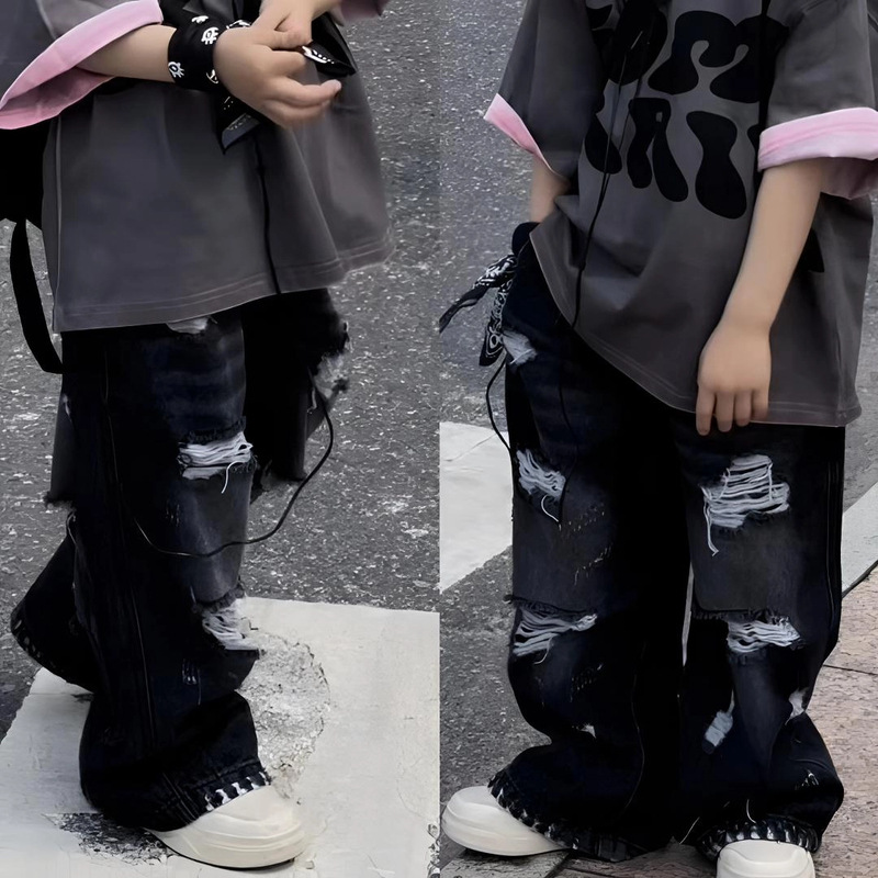 2025 새로운 어린이 아메리칸 스타일 스트리트 리핑 디자인 센스 틈새 청바지, 트렌디 한 루즈 하이 스트리트 바지스토어 가기