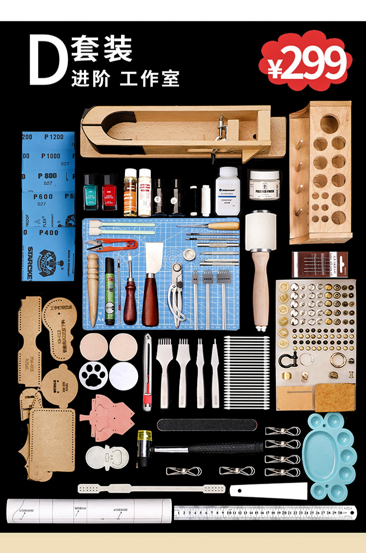 • D세트 58개입 (손바느질 나무집게 + 다림질 오일 + 수입화학재료) [베지터블 태닝 가죽 소재 패키지]