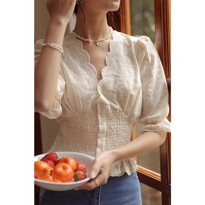 프렌치 레트로 3 차원 작은 꽃 반팔 셔츠 여성용 여름 레이스 레이스 V 넥 슬림 핏 퍼프 슬리브 탑스토어 가기