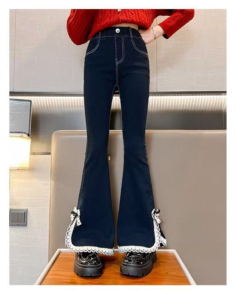 소녀들의 봄 데님 꽃 바지 2025 새로운 스타일 소녀의 활 분할 바지 어린이를위한 유행 유행 바지