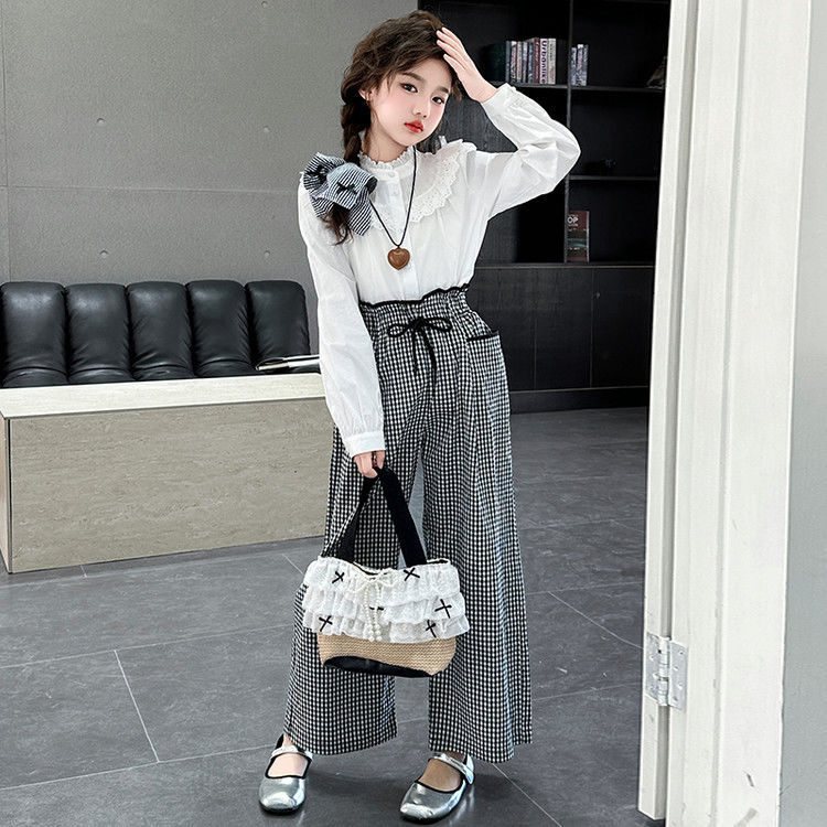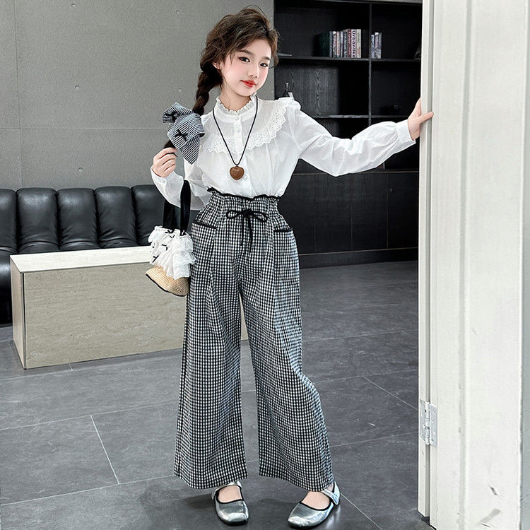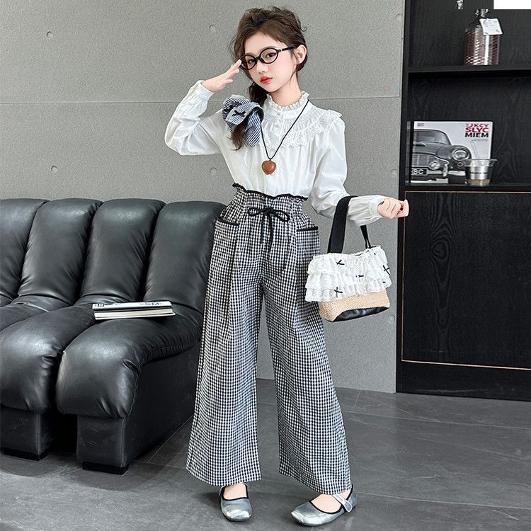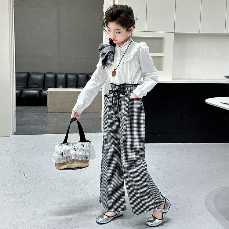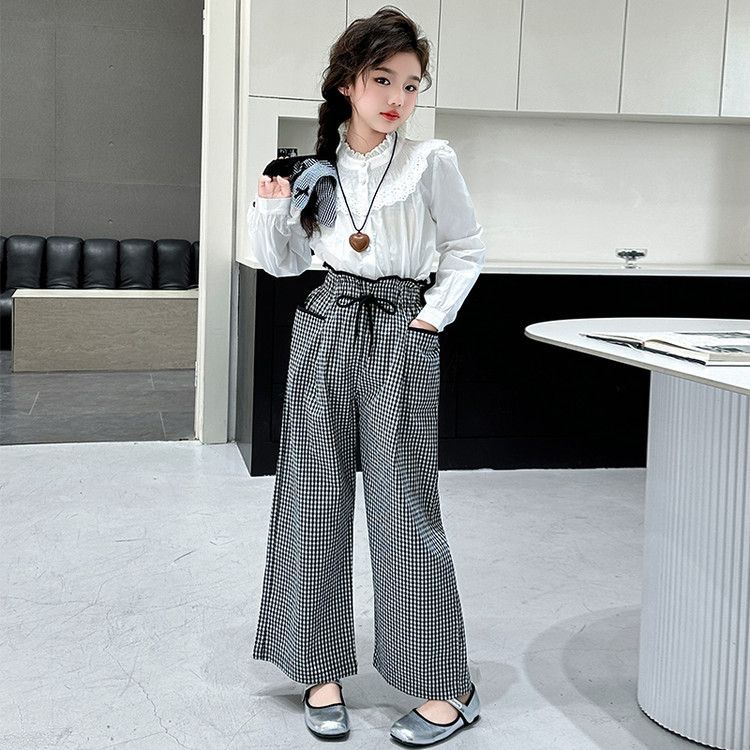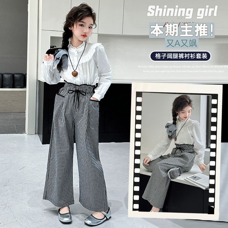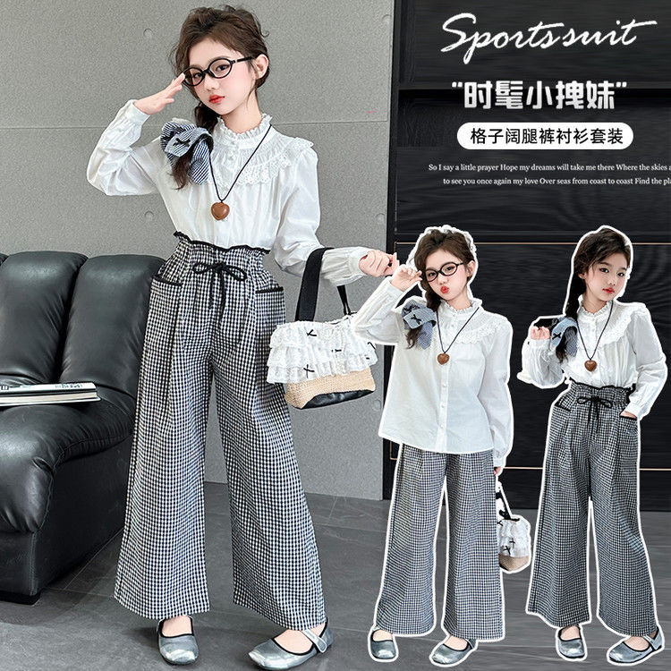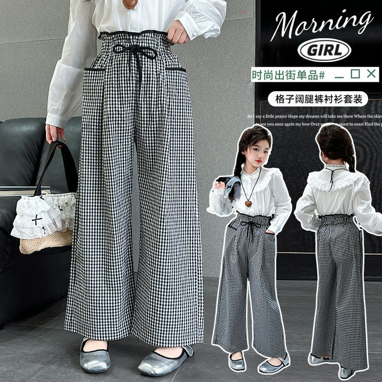 소녀의 봄 긴 소매 셔츠 세트 2025 새로운 세련된 유행 소녀의 격자 무늬 넓은 다리 바지 봄과 가을 두 조각 세트스토어 가기