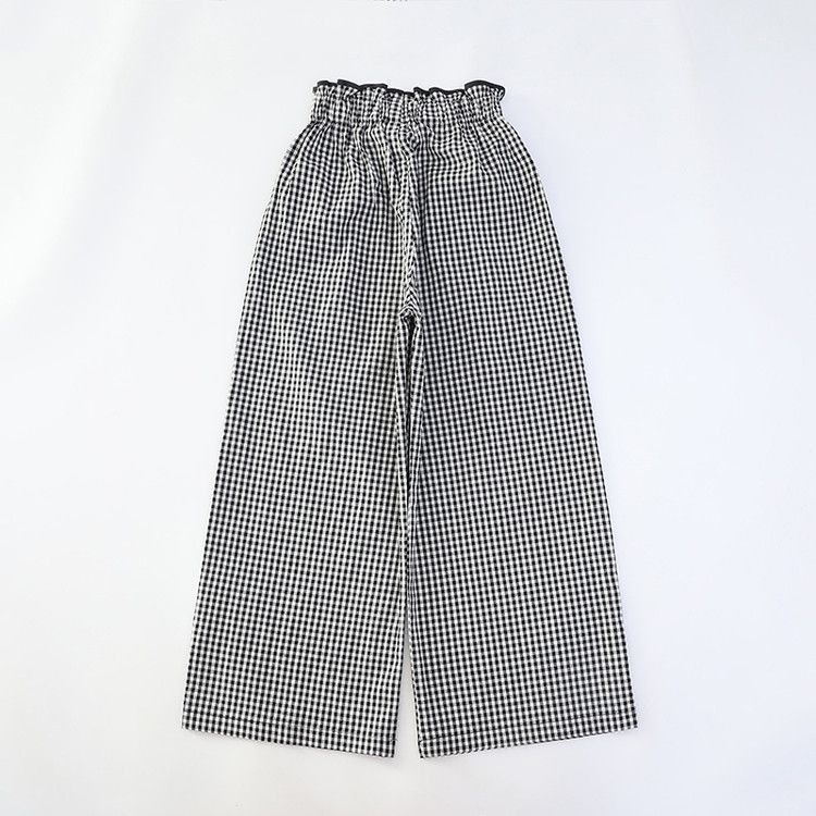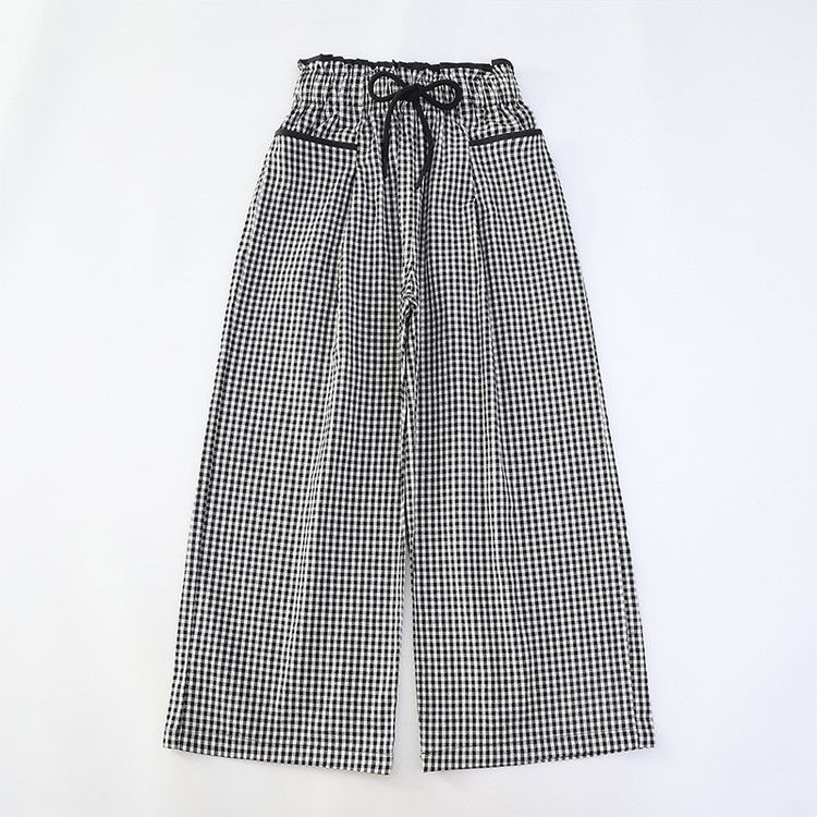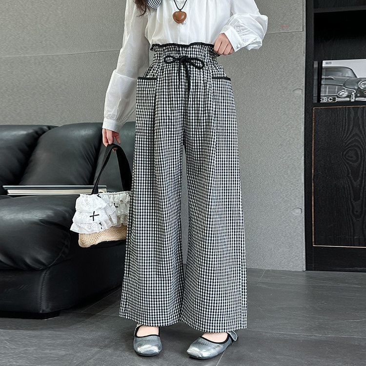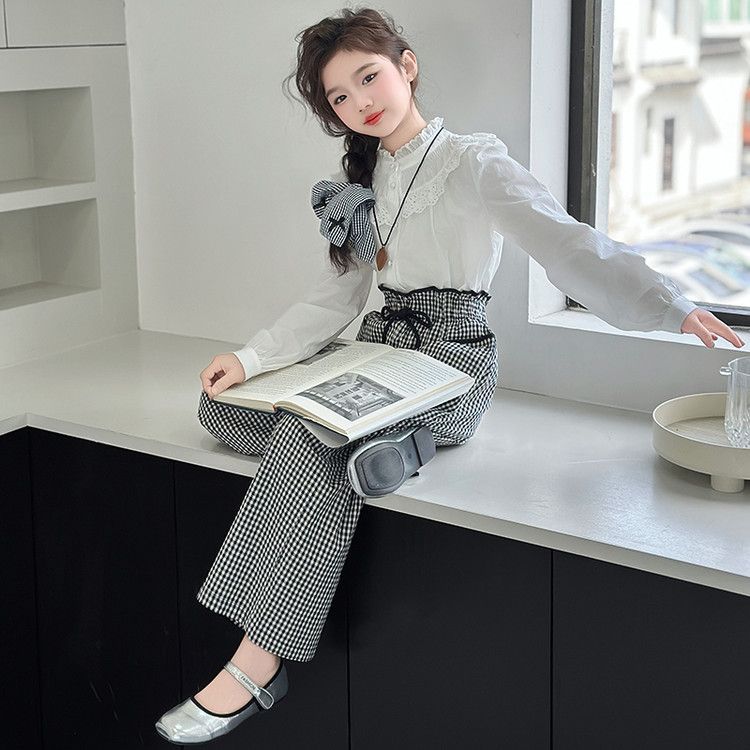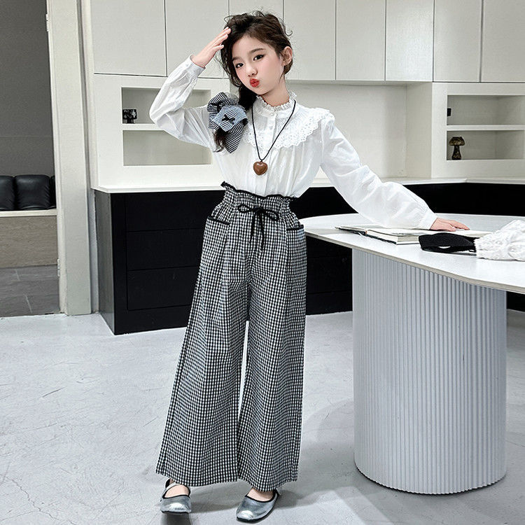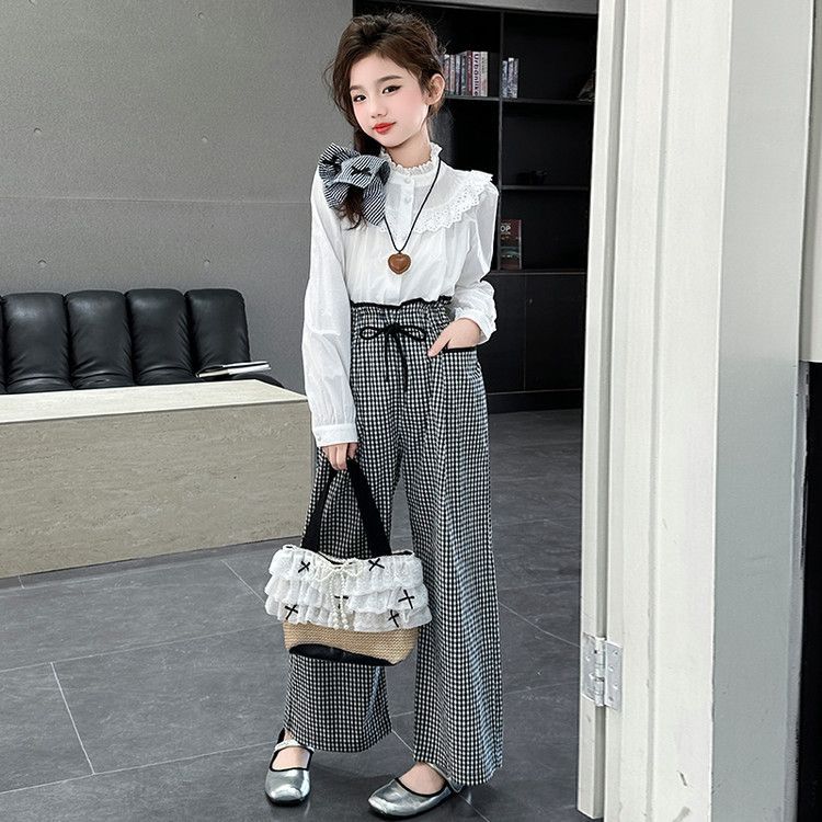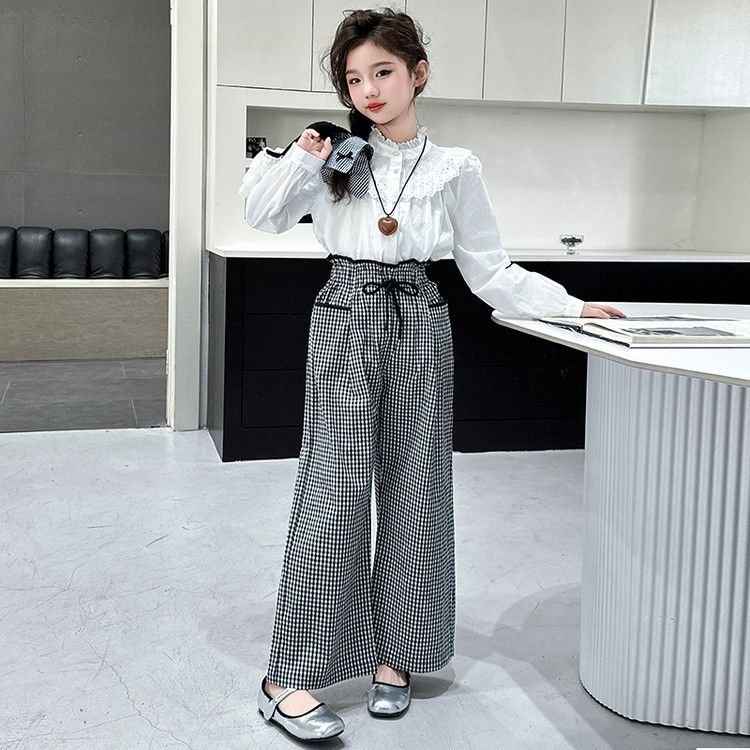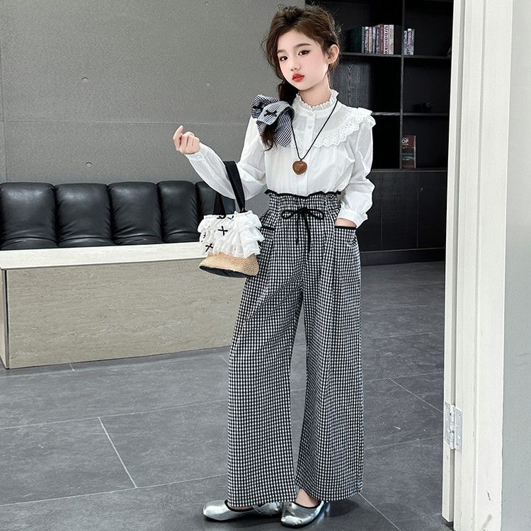 소녀의 봄 긴 소매 셔츠 세트 2025 새로운 세련된 유행 소녀의 격자 무늬 넓은 다리 바지 봄과 가을 두 조각 세트스토어 가기