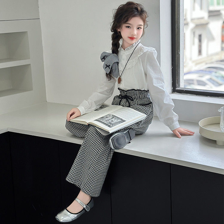소녀의 봄 긴 소매 셔츠 세트 2025 새로운 세련된 유행 소녀의 격자 무늬 넓은 다리 바지 봄과 가을 두 조각 세트