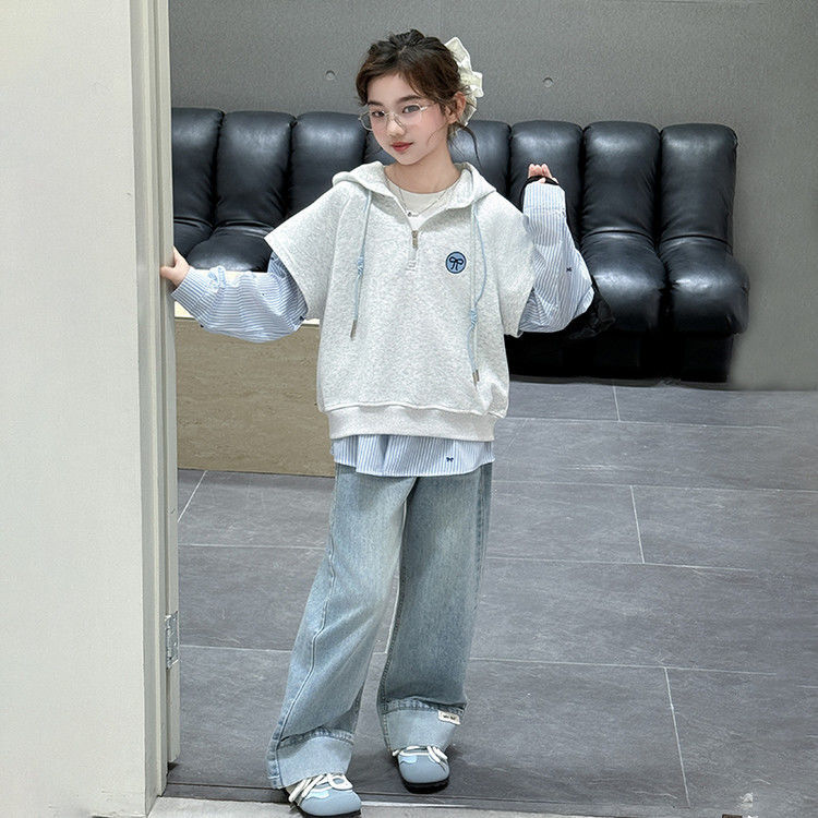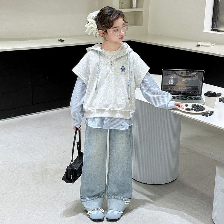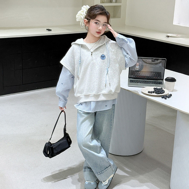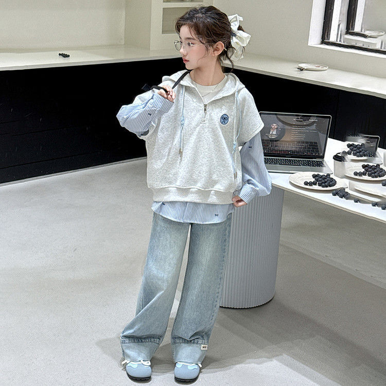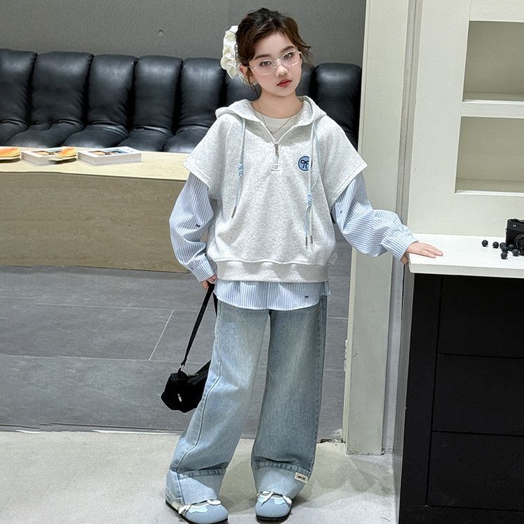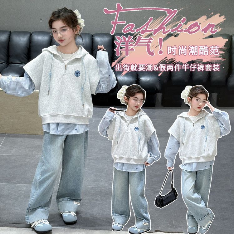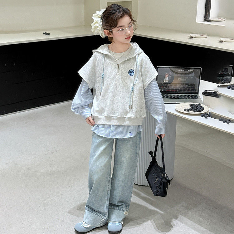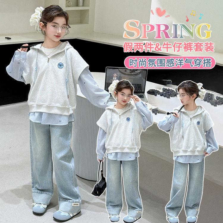 소녀 세트 봄과 가을 2025 새로운 서양식 어린이 유행 캐주얼 봄 원피스 소녀 탑 후드 투피스 세트