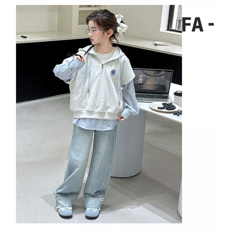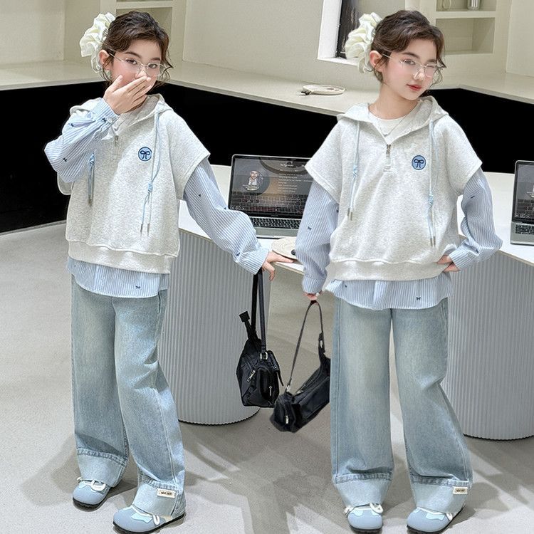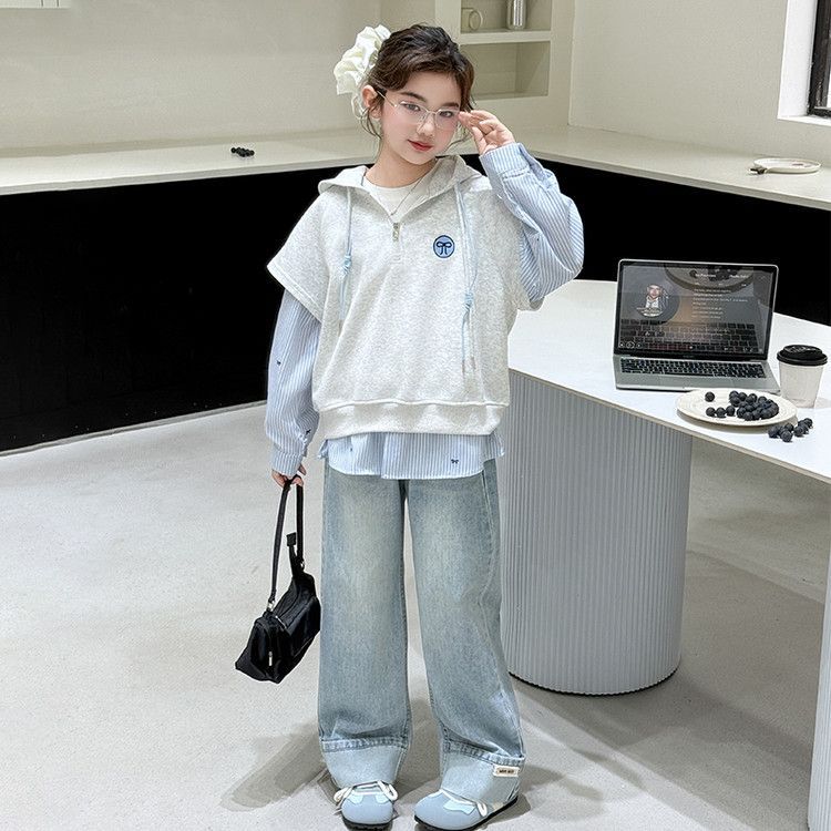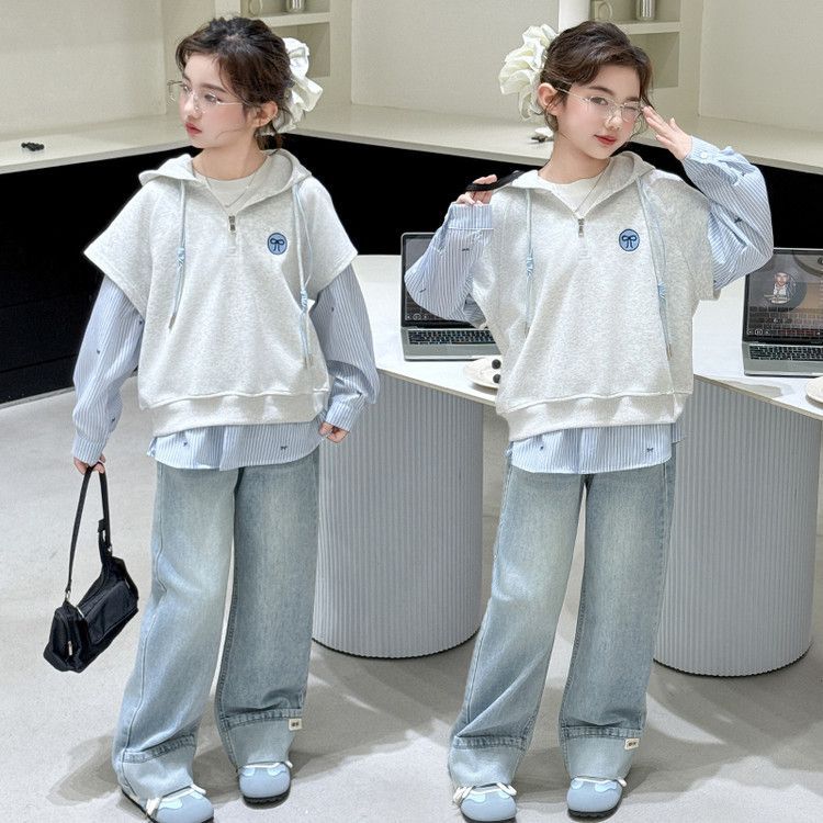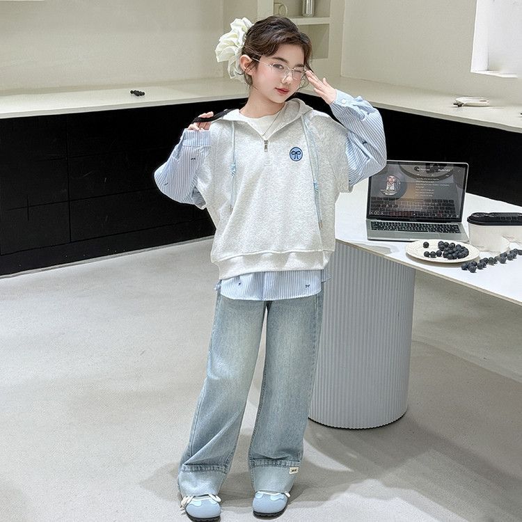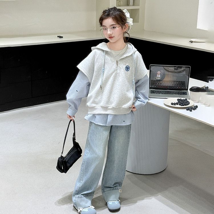 소녀 세트 봄과 가을 2025 새로운 서양식 어린이 유행 캐주얼 봄 원피스 소녀 탑 후드 투피스 세트스토어 가기