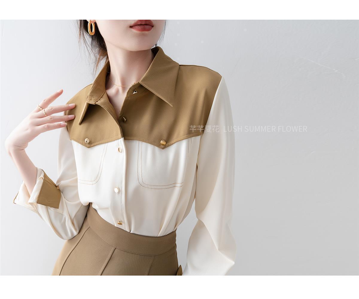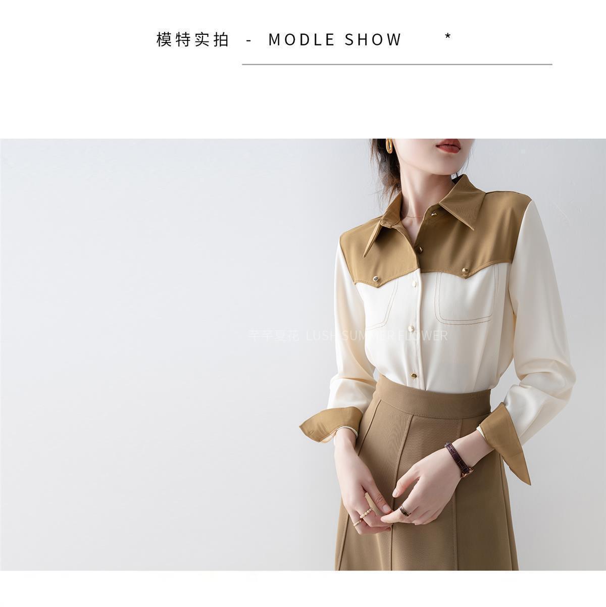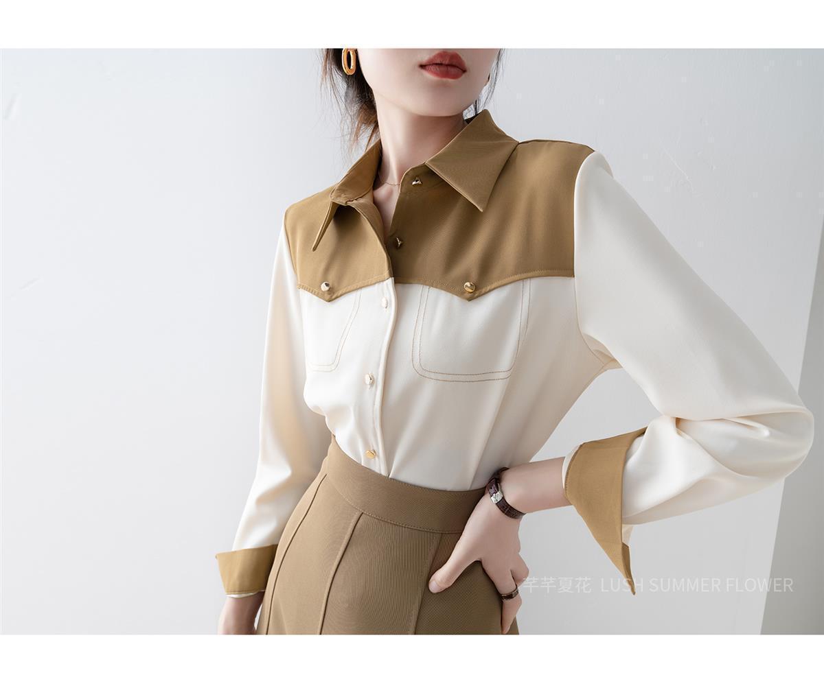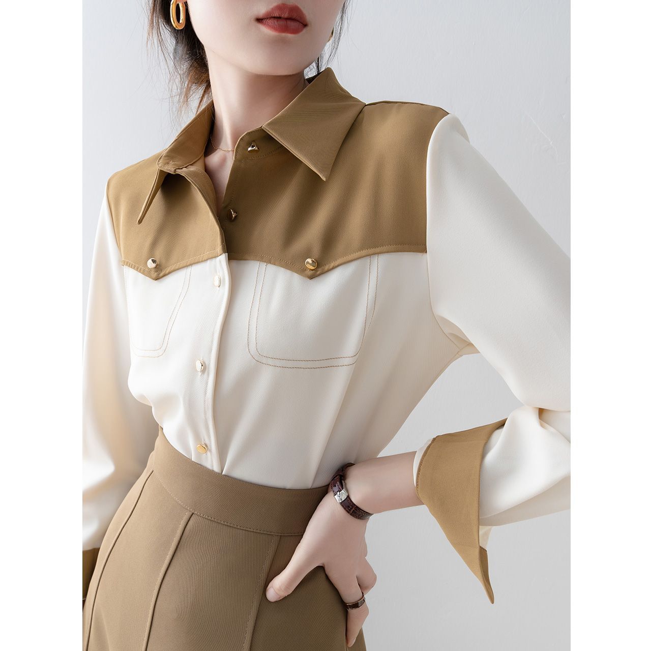 콘트라스트 컬러 스티칭 폴로 칼라 셔츠 년 새해 가을 여성 프랑스 스타일 작은 셔츠 비즈니스 착용 통근 긴 소매 셔츠