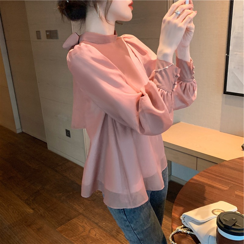리얼 샷 2025 봄 스위트 코트 랜턴 버블 슬리브 보우 셔츠 요정 쉬폰 셔츠 탑스토어 가기