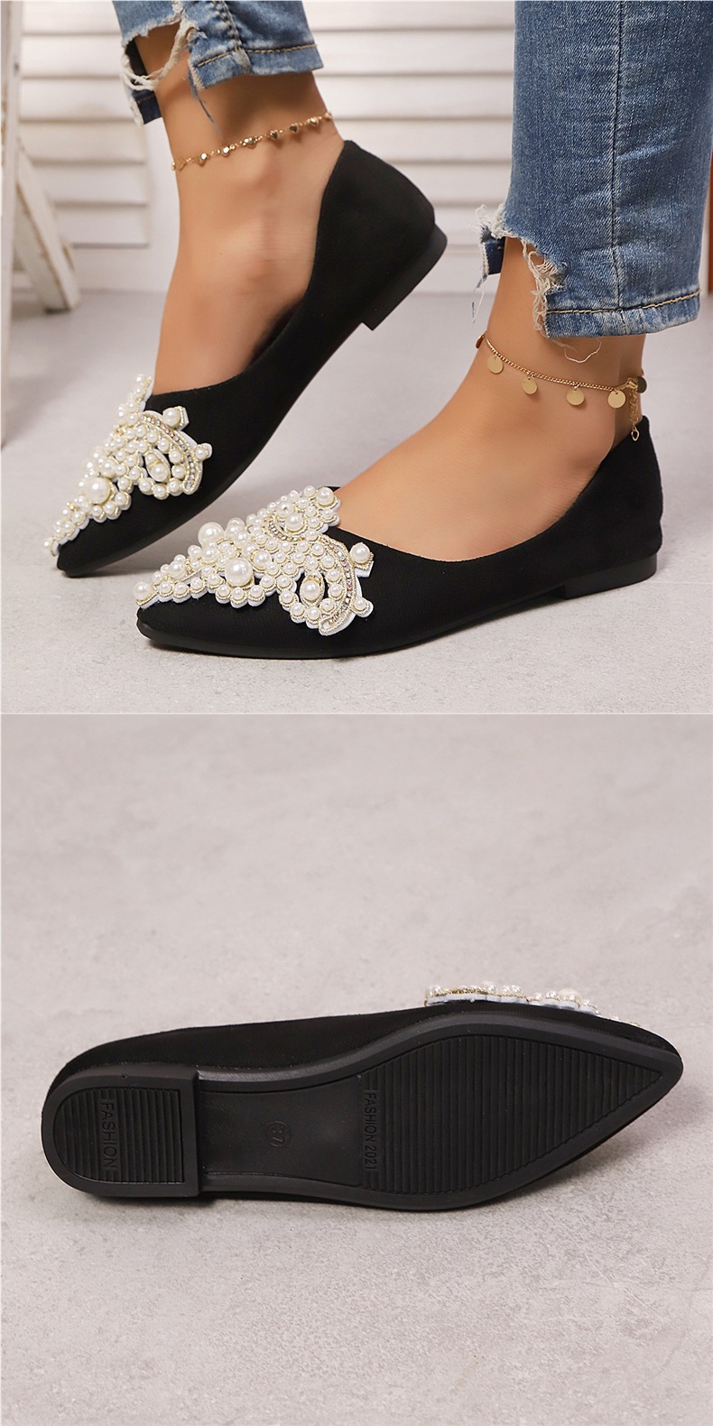 2025 년 봄, 요정 바람의 새로운 한국어 버전은 평평한 플러스 사이즈 진주 모조 다이아몬드 신발 대형 신발 36-43스토어 가기