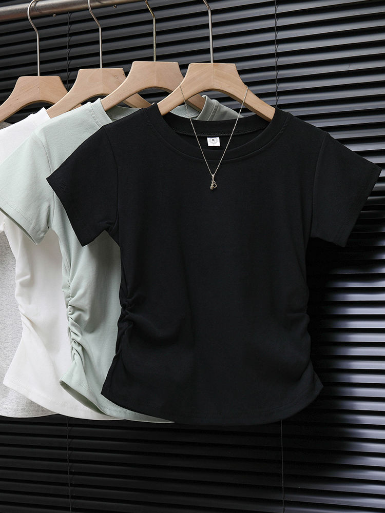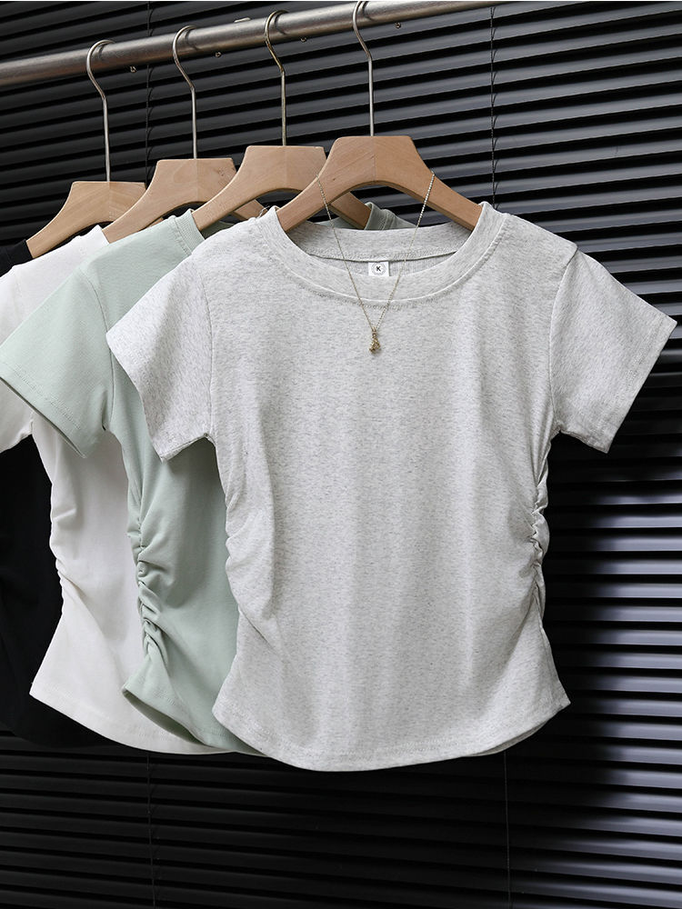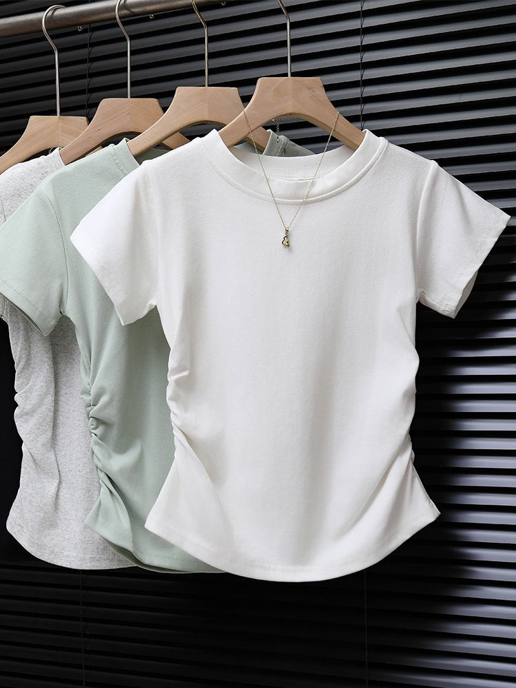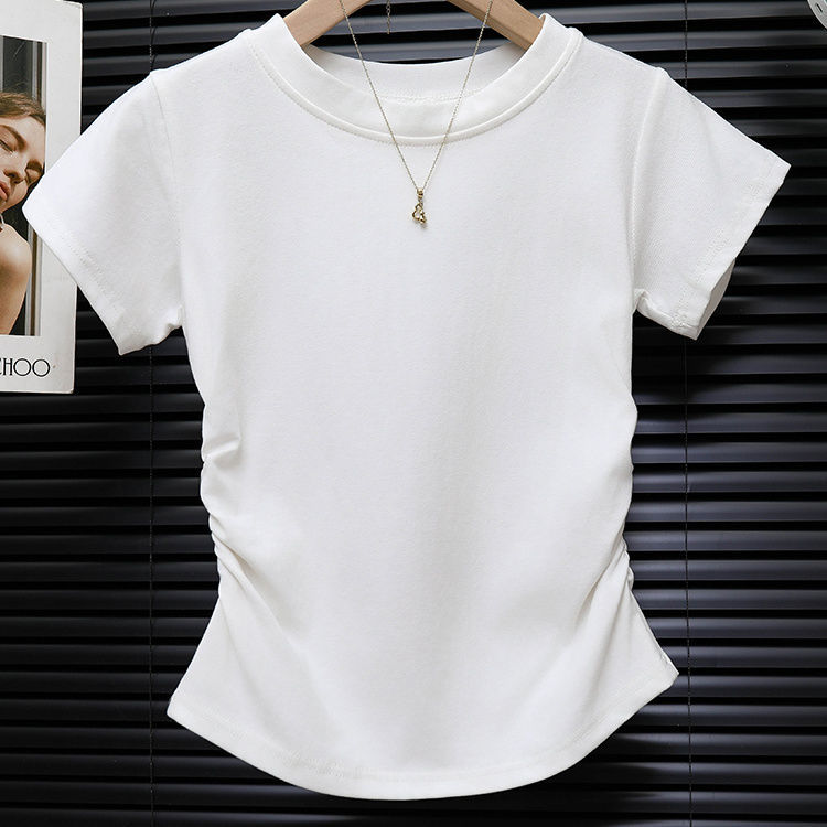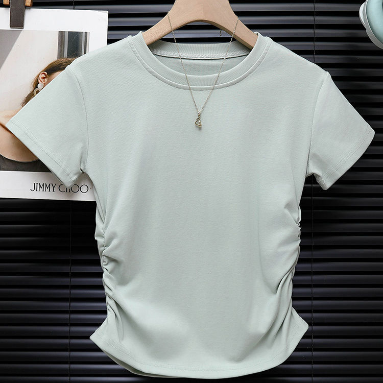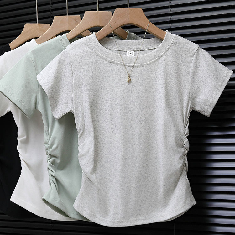 새로운 여름 라운드 넥 디자인 꽉 허리 모든 경기 슬리밍 반팔 어깨 솔리드 컬러베이스 티셔츠 여성용스토어 가기