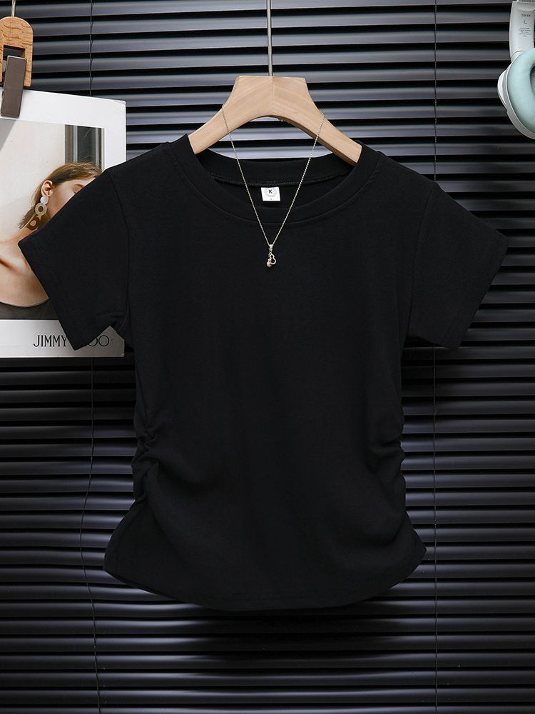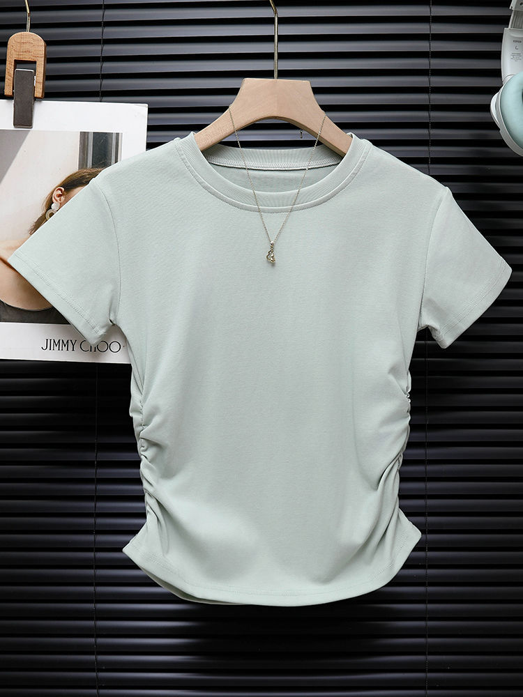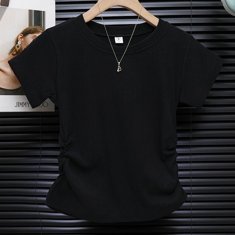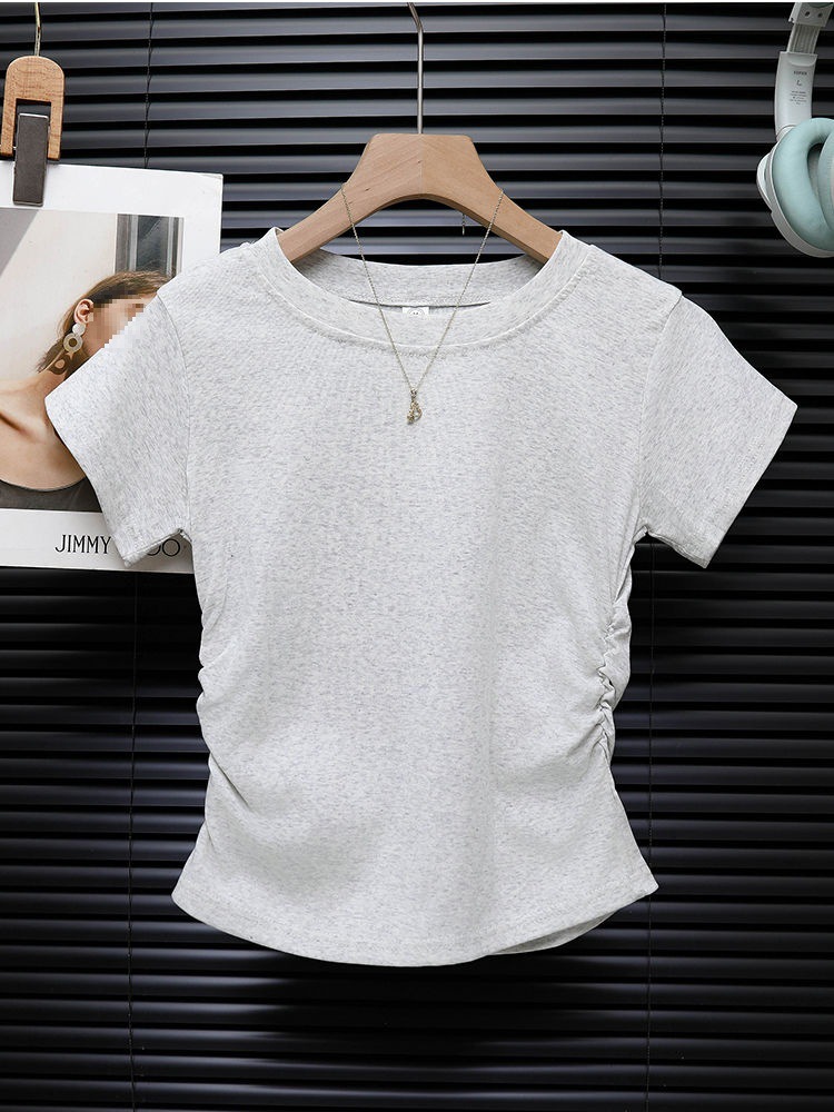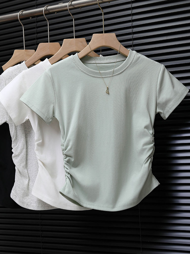새로운 여름 라운드 넥 디자인 꽉 허리 모든 경기 슬리밍 반팔 어깨 솔리드 컬러베이스 티셔츠 여성용스토어 가기