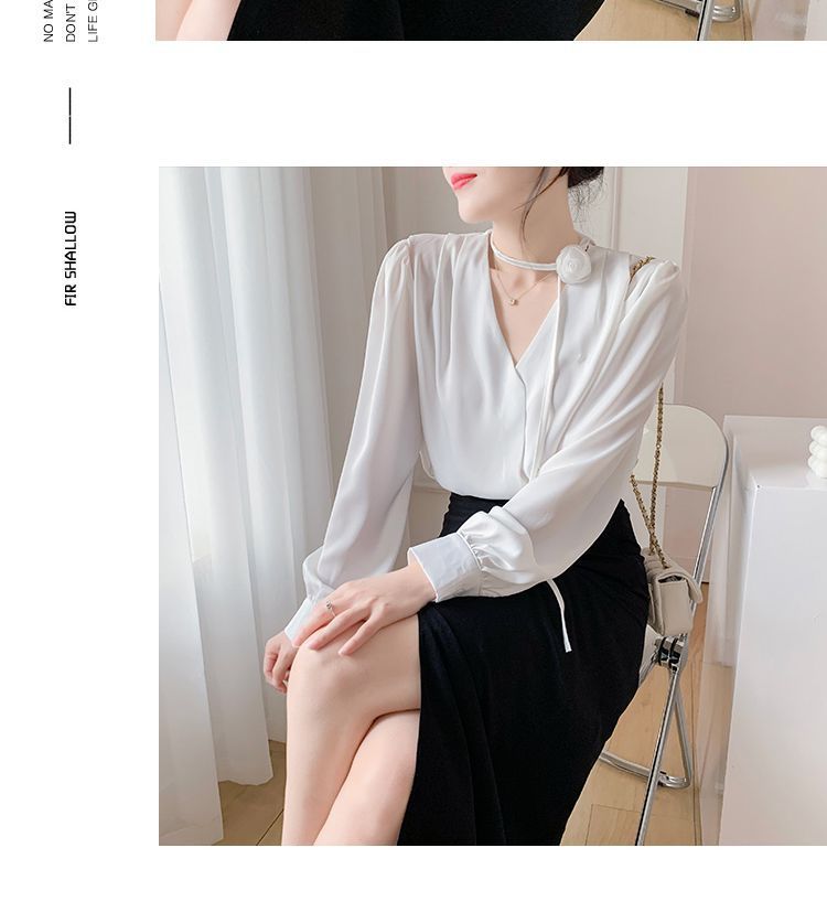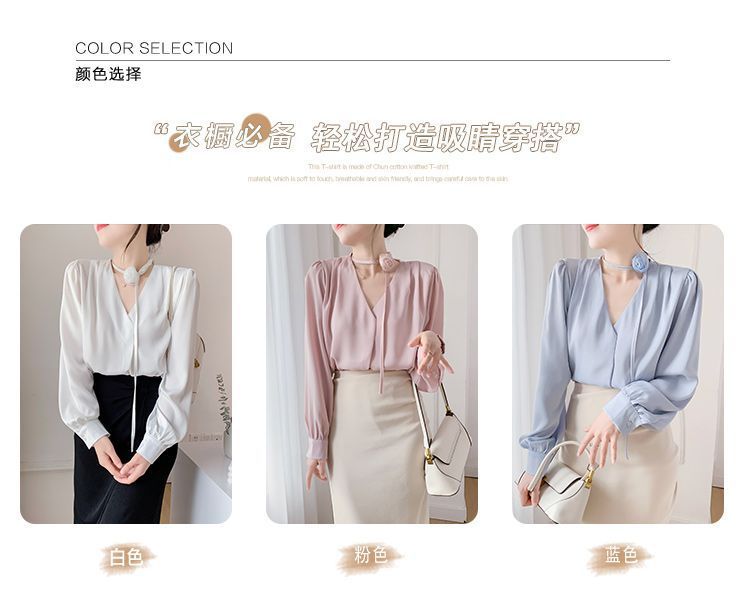 프랑스 스타일의 부드러운 스타일 장미 교수형 목 핑크 셔츠 여성의 봄과 가을 하이 엔드 틈새 Chic V-넥 쉬폰 탑 Ins스토어 가기
