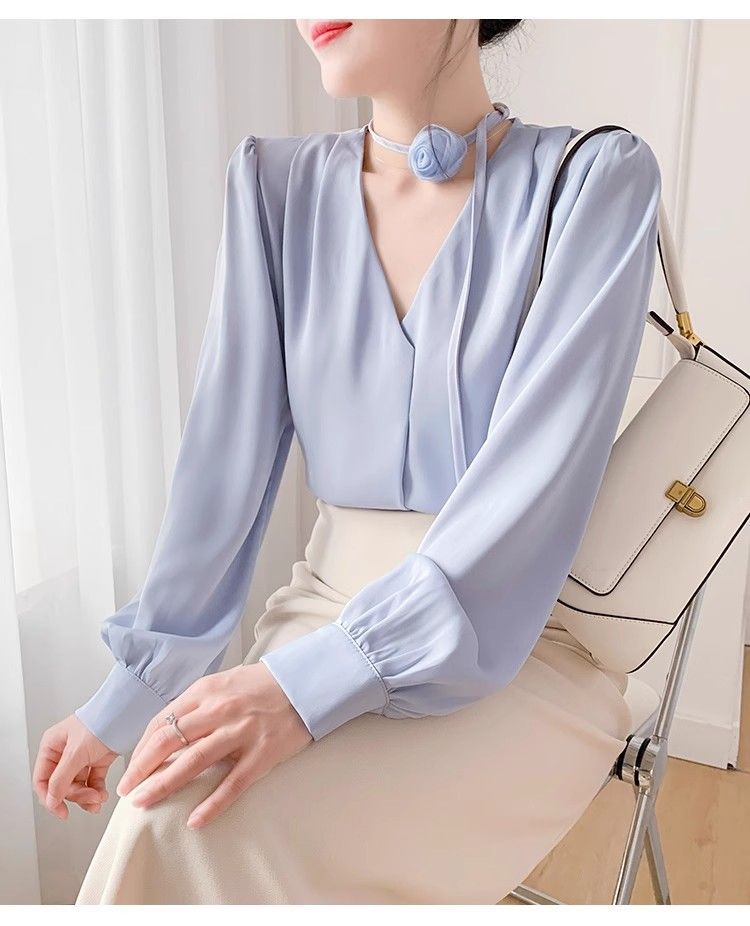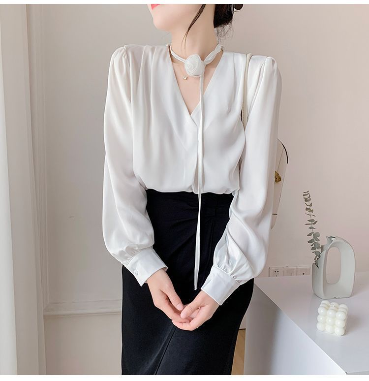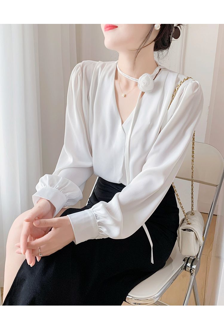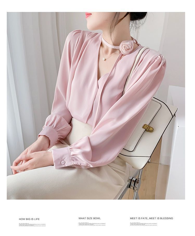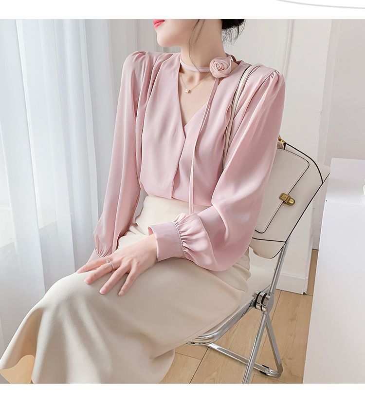 프랑스 스타일의 부드러운 스타일 장미 교수형 목 핑크 셔츠 여성의 봄과 가을 하이 엔드 틈새 Chic V-넥 쉬폰 탑 Ins