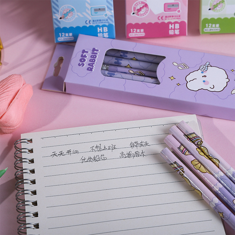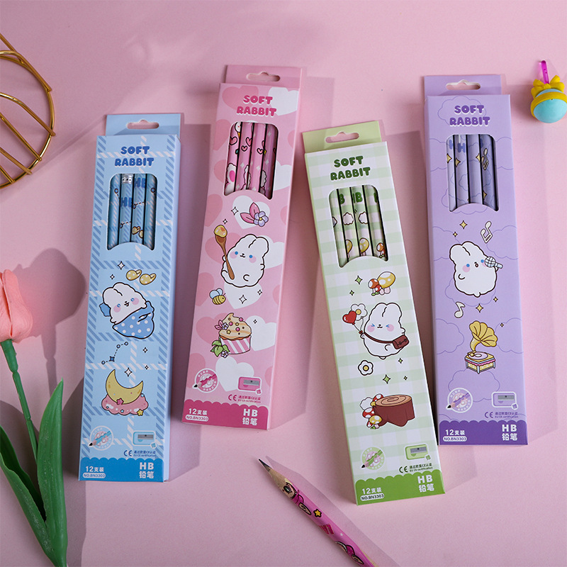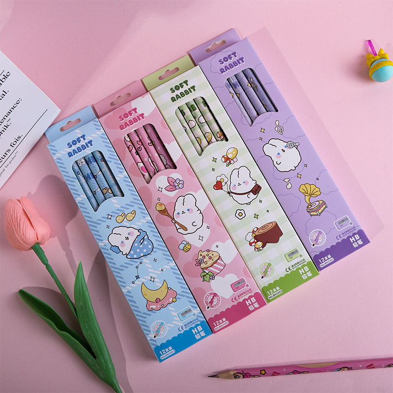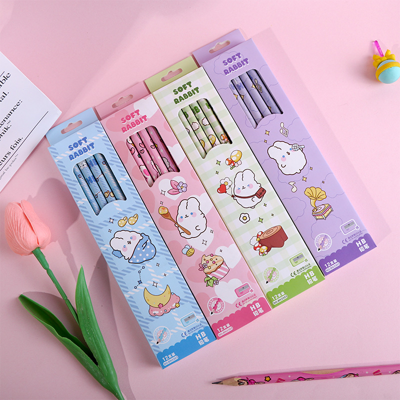 격자형 토끼 만화 연필 귀여운 어린이 HB 연필 초등학생이 서예를 연습할 수 있는 고급 연필 세트 12개