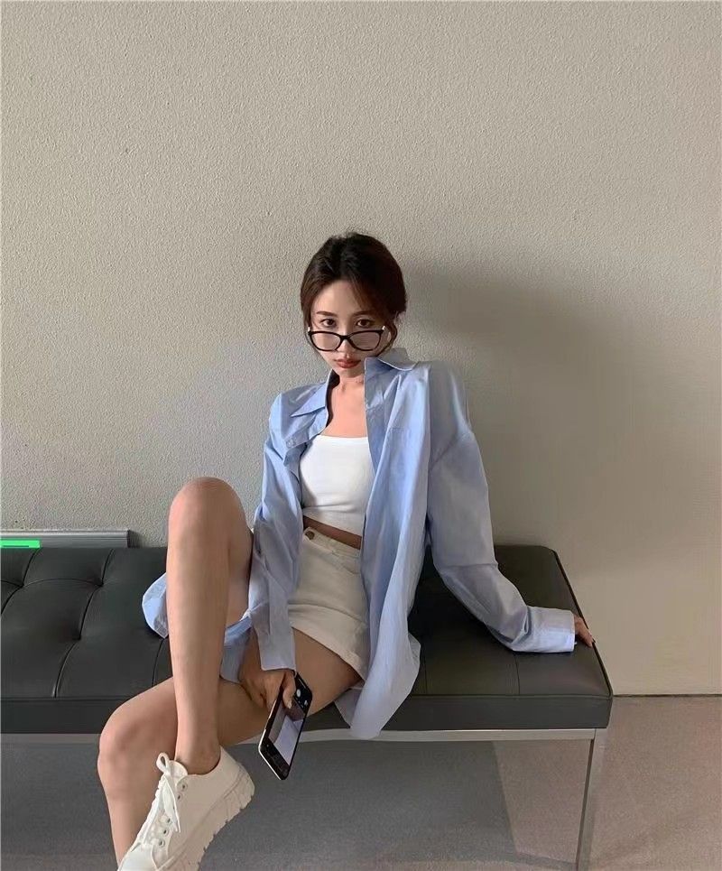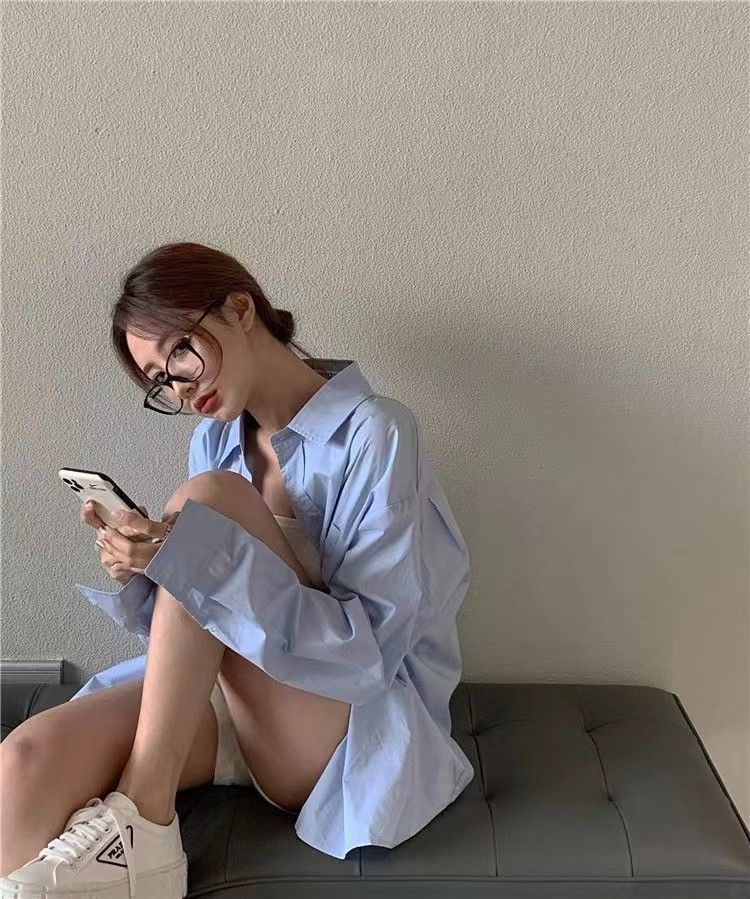 프랑스 클라인 블루 긴 소매 코튼 셔츠 여성의 이른 가을 최고 패션 올 매치 아우터 셔츠 여성 크로스-국경 도매스토어 가기