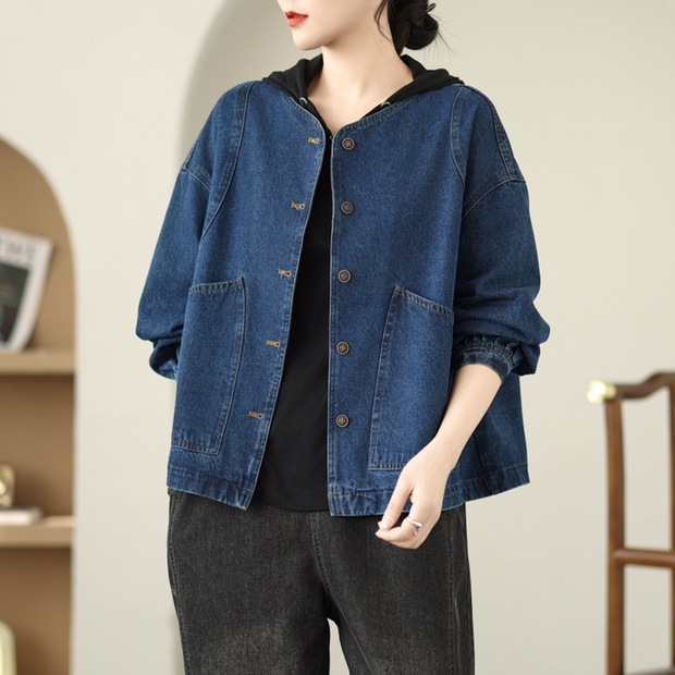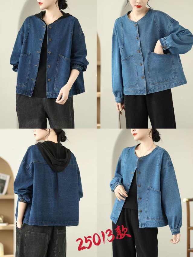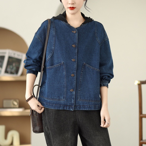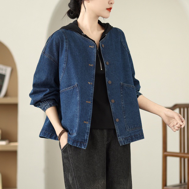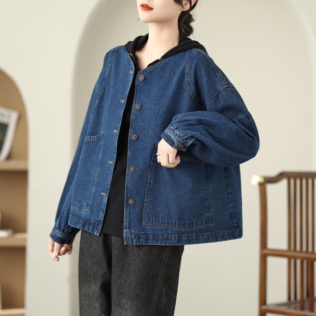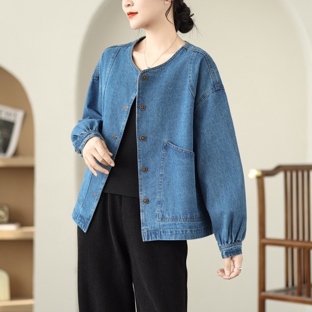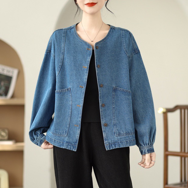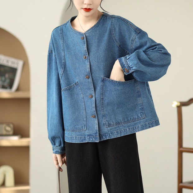 큰 포켓 데님 코트 여성의 봄과 가을 패션 디자인 바느질 둥근 목 느슨한 캐주얼 외부 카디건