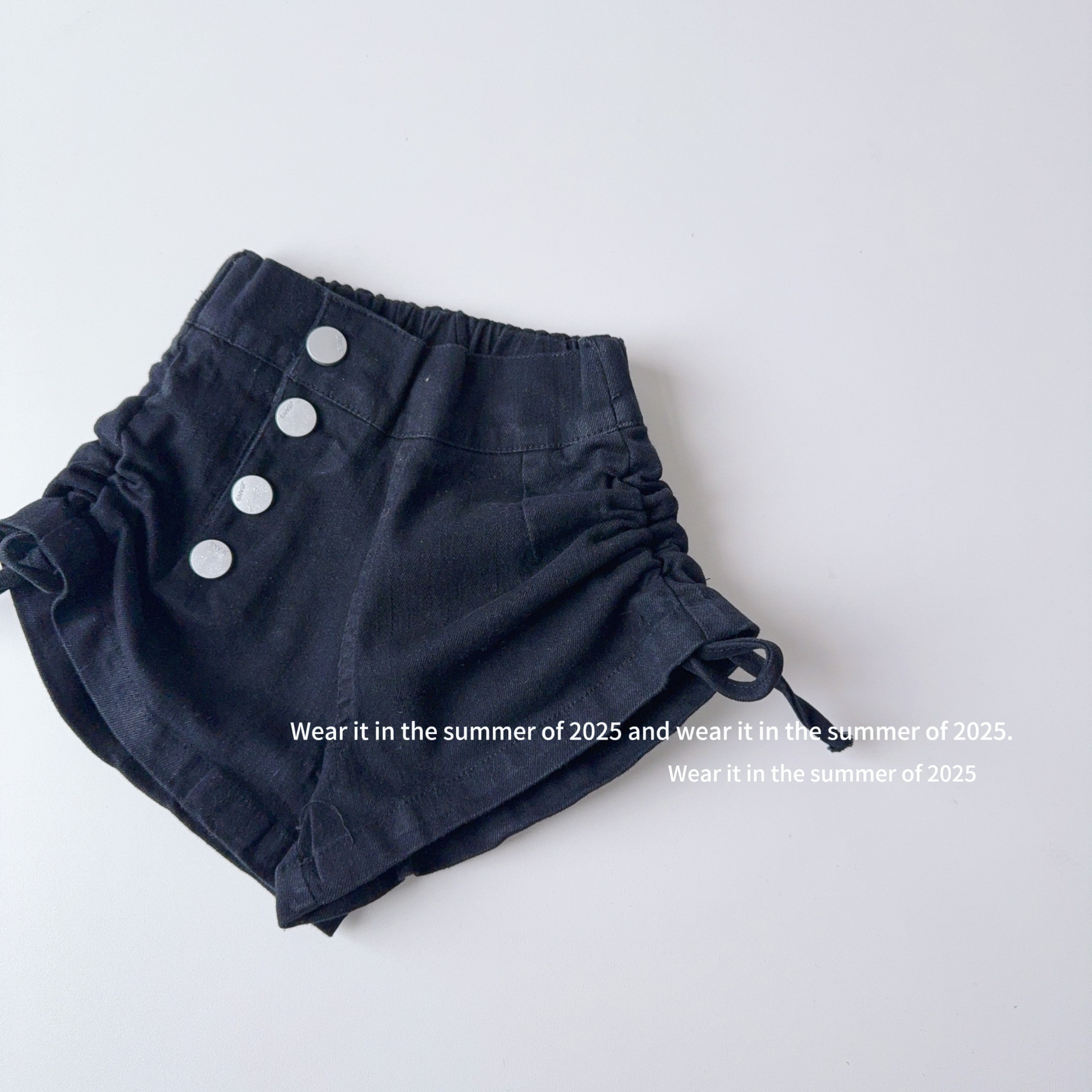 어린이 2025 년 여름 소녀 스타일 드로스트링 버튼 블랙 반바지 어린이 핫 바지 여성 아기 탄성 바지스토어 가기