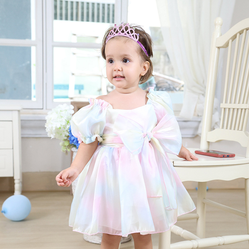 2025 여름 새로운 다채로운 그라디언트 다채로운 무지개 퍼프 소매 인어 공주 활 아기 원피스