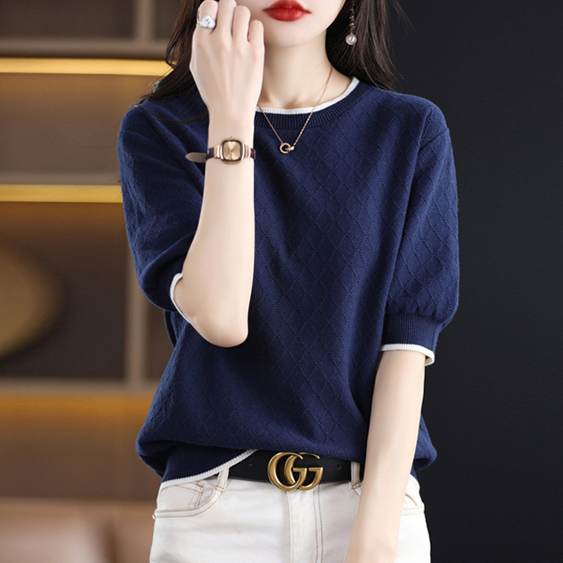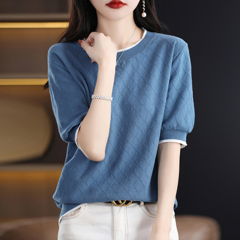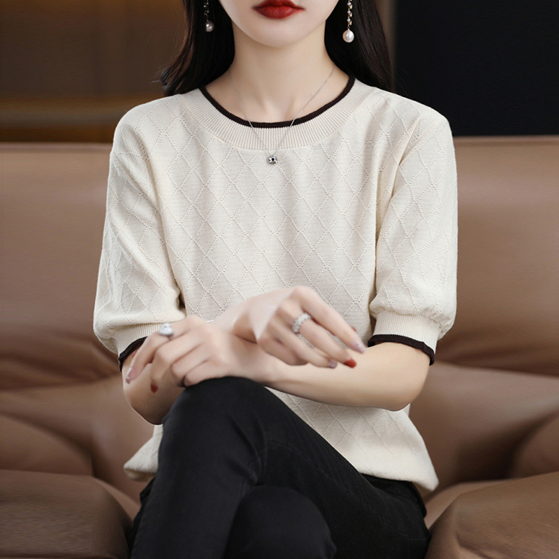 아이스 실크 니트 스웨터 여자 반팔 셔츠 여름 2025 새로운 컬러 매칭 다이아몬드 올매치 느슨한 반소매 얇은 탑