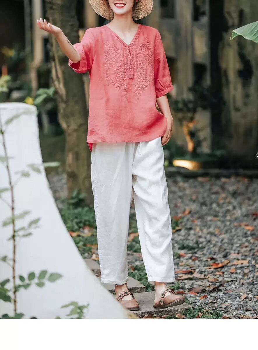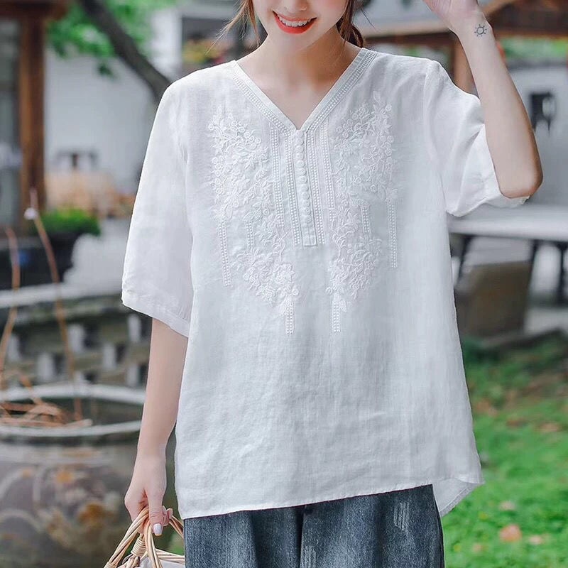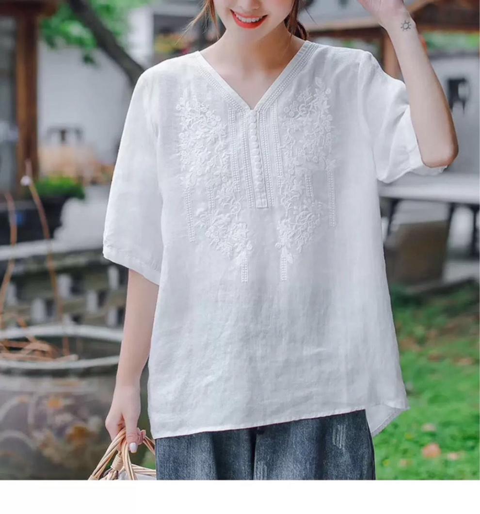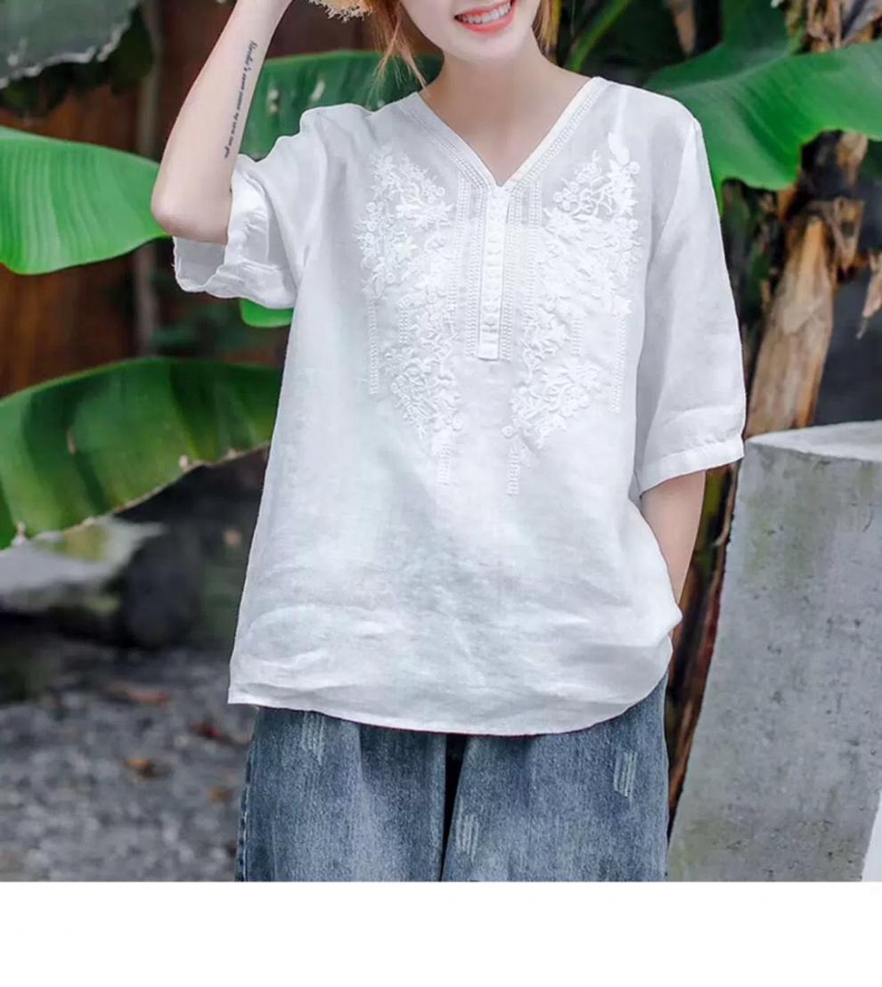 반팔 여름 여성 최고의 예술적 빈티지 자수 면화 및 린넨 우아한 V 넥 느슨한 풀오버 티셔츠 여성용 2024