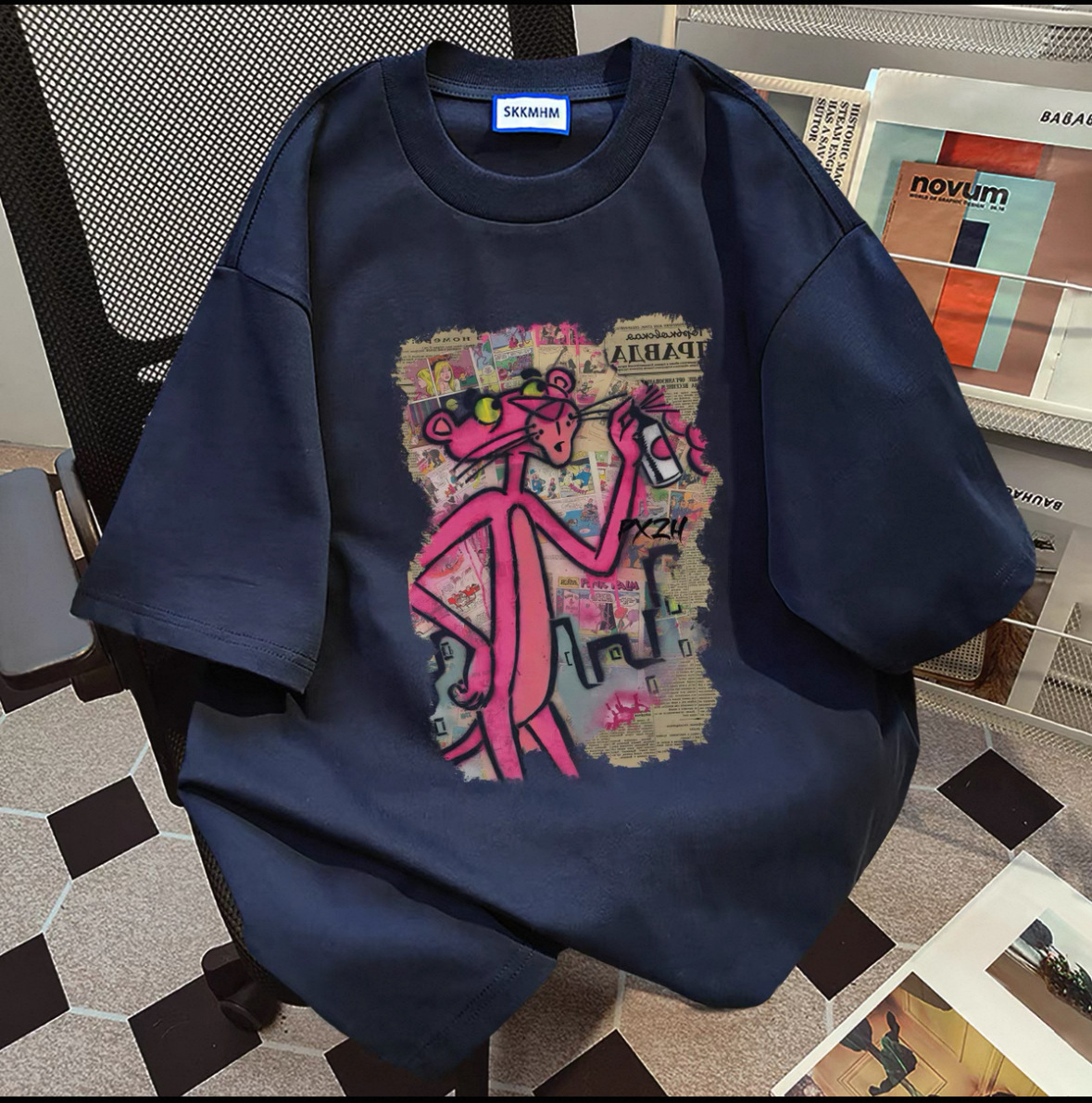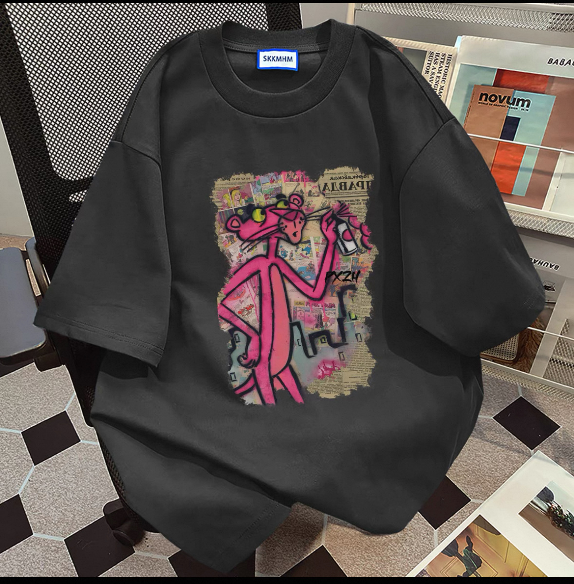 아메리칸 스타일 코튼 카툰 프린트 반팔 티셔츠 여성 2025 년 여름 새로운 느슨한 화이트 그레이 올 매치 커플 탑