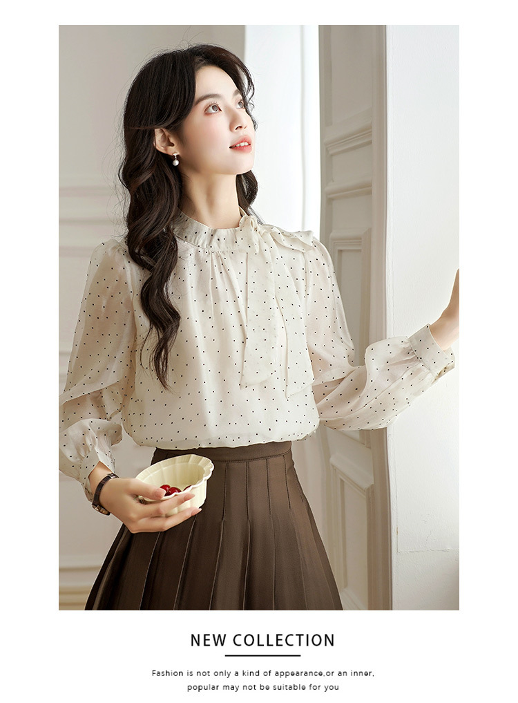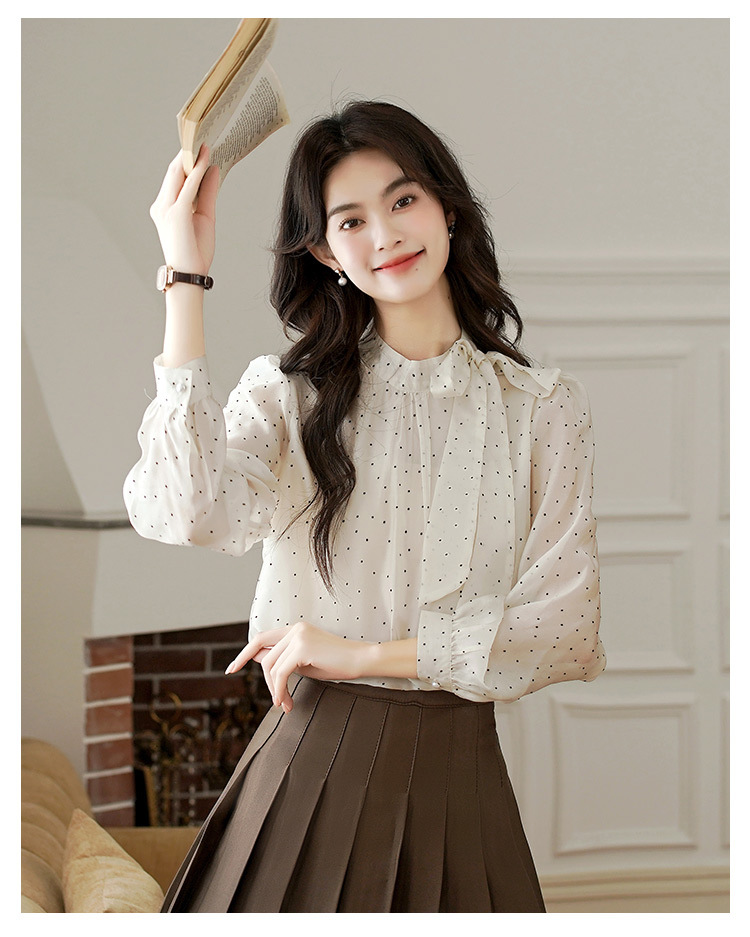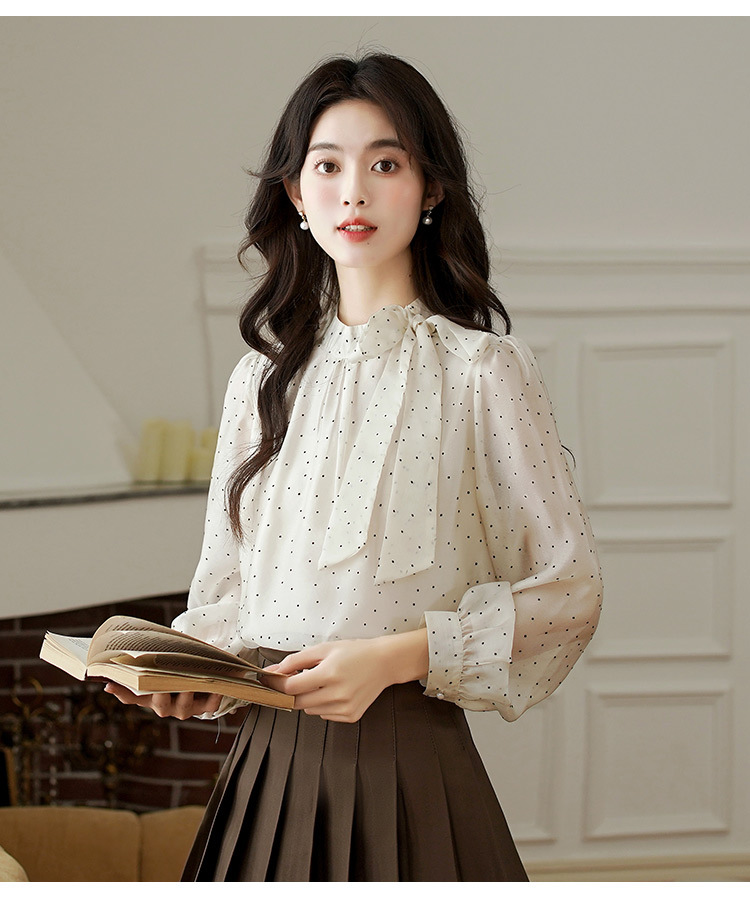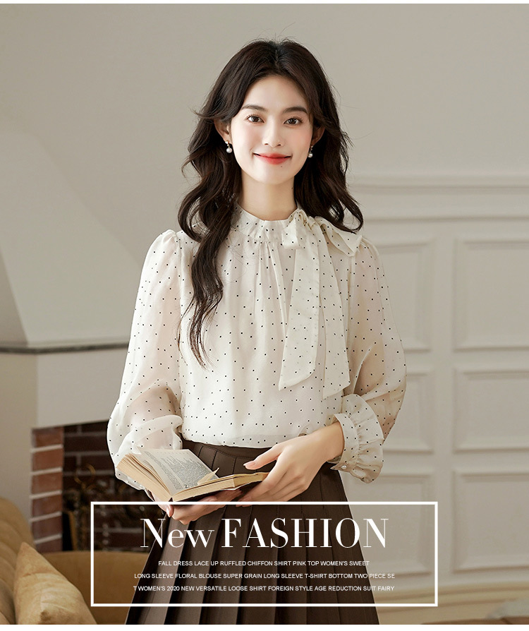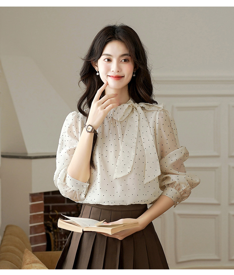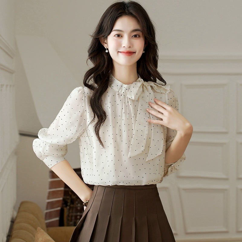 2025 봄 새로운 프랑스 달콤한 폴라 도트 셔츠 여성용 활 사이드 스트랩 쉬폰 셔츠 탑스토어 가기