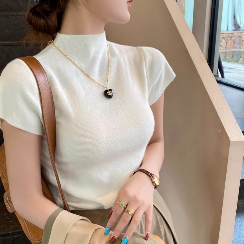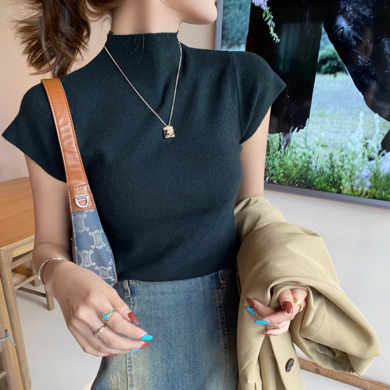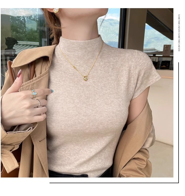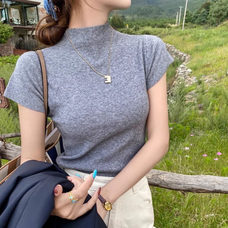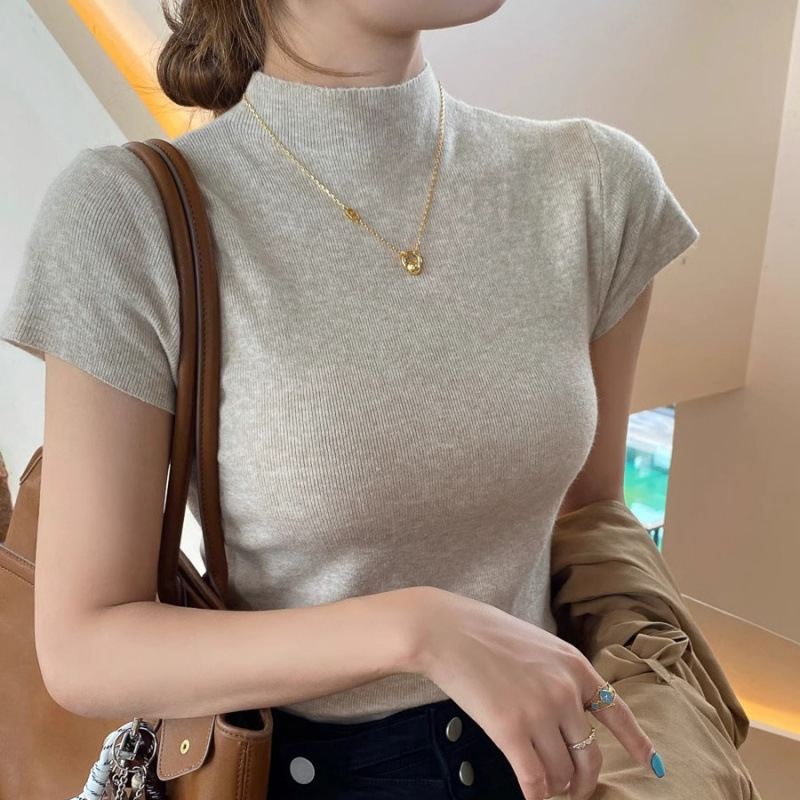 여성용 하프 터틀넥 니트 반소매 베이스 셔츠 2024 이른 봄 가을 뉴 그레이 내부 슬림 핏 탑스토어 가기