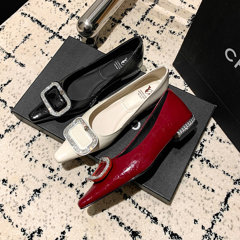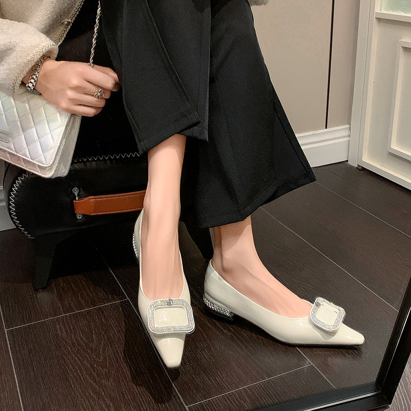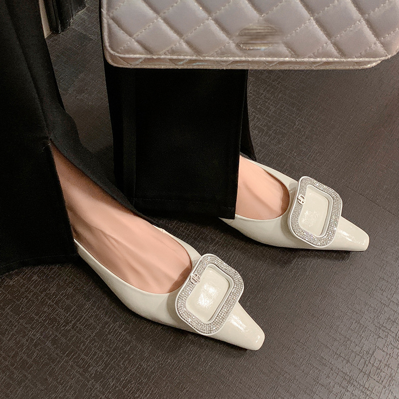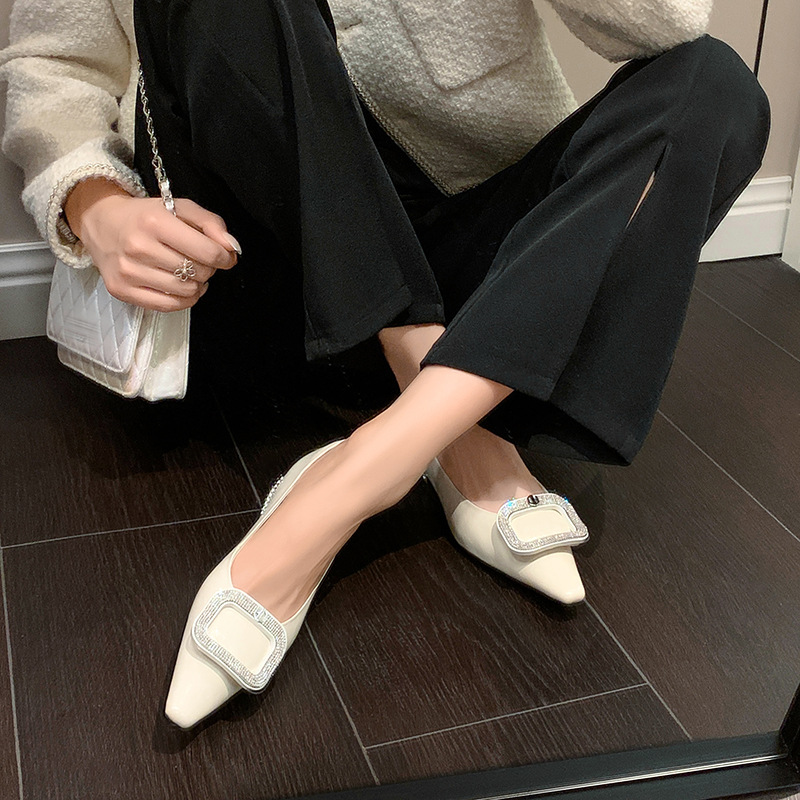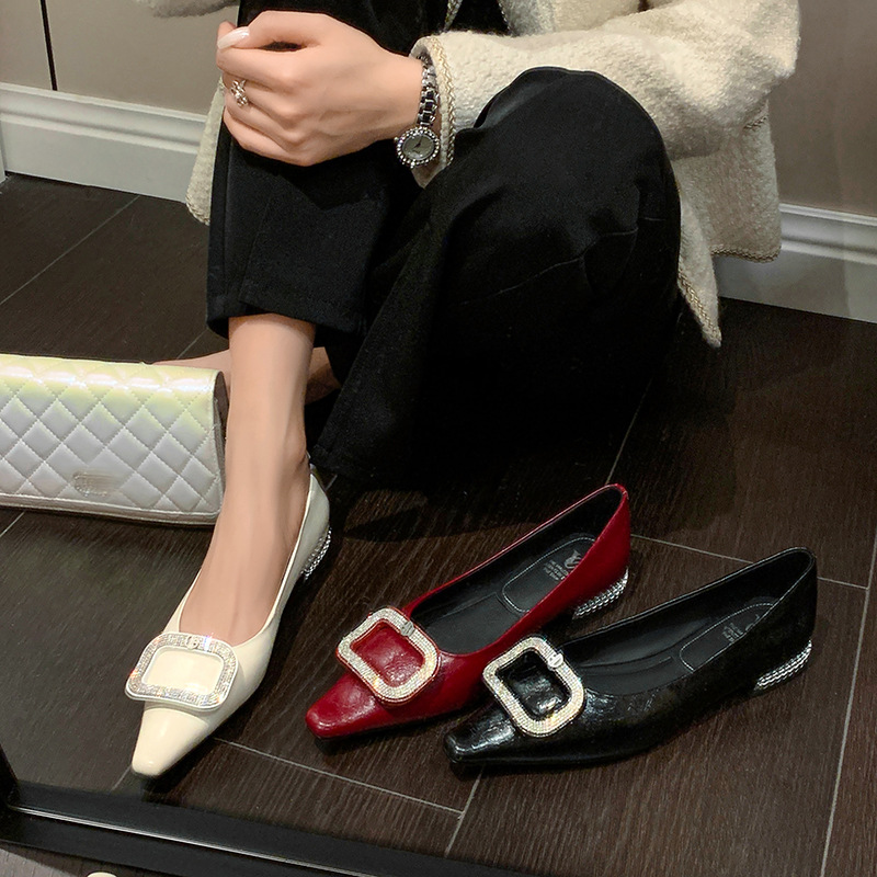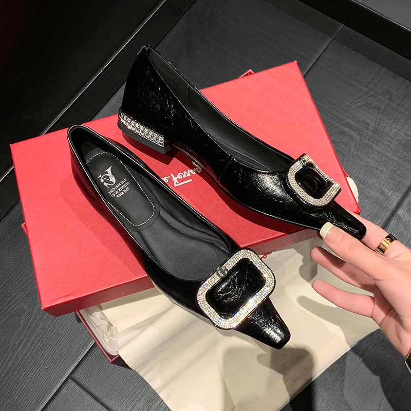 절묘한 여신! 가벼운 럭셔리 사교계 스타일 라인 스톤 스퀘어 버클 여성 신발 봄 원피스 뾰족한 저발 지치지 않는 발 싱글 레이어 신발스토어 가기