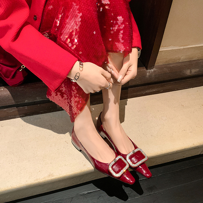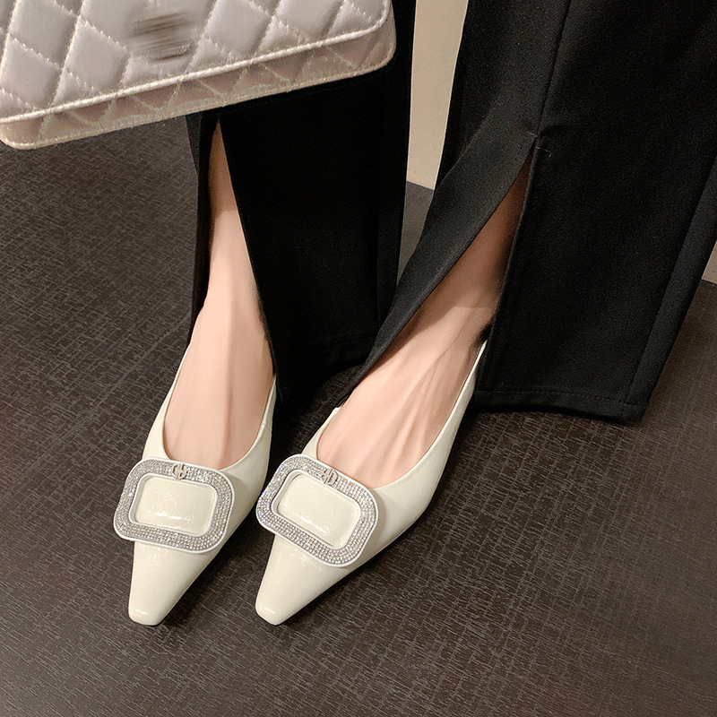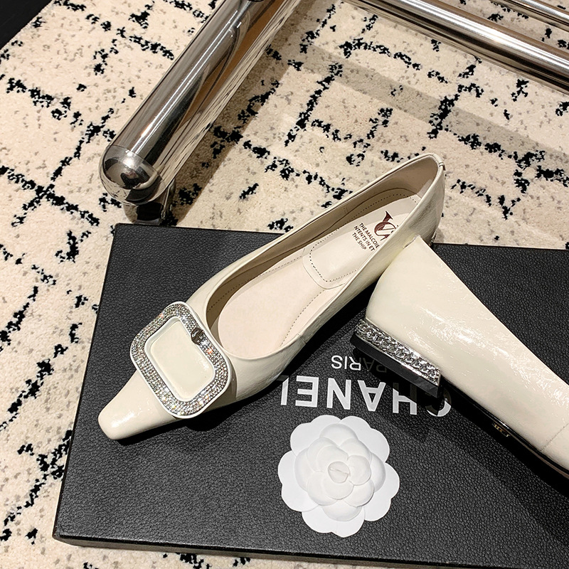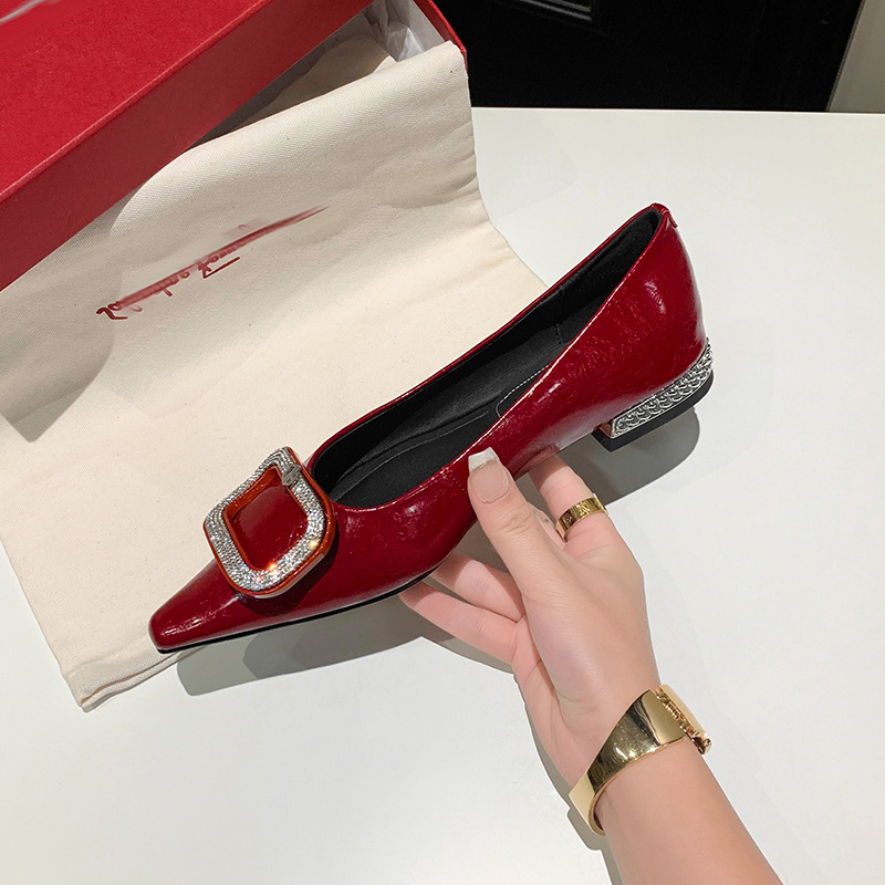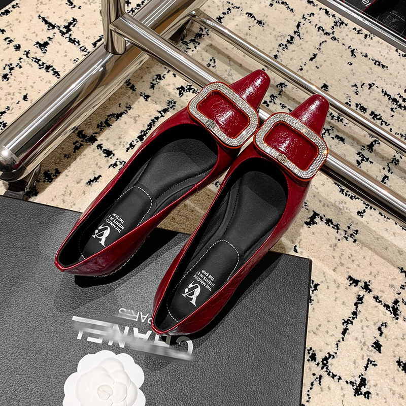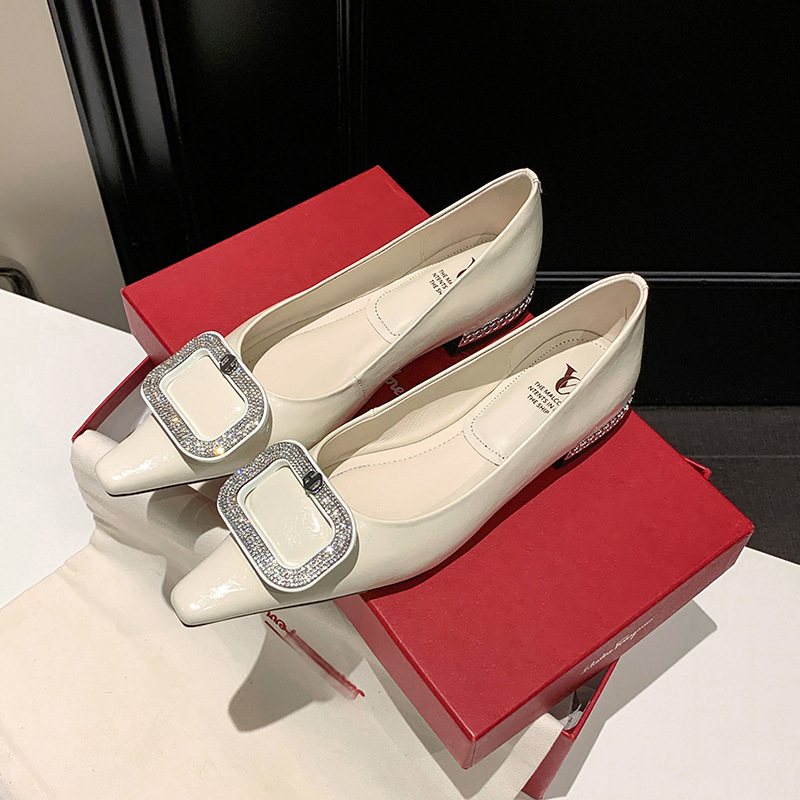 절묘한 여신! 가벼운 럭셔리 사교계 스타일 라인 스톤 스퀘어 버클 여성 신발 봄 원피스 뾰족한 저발 지치지 않는 발 싱글 레이어 신발스토어 가기