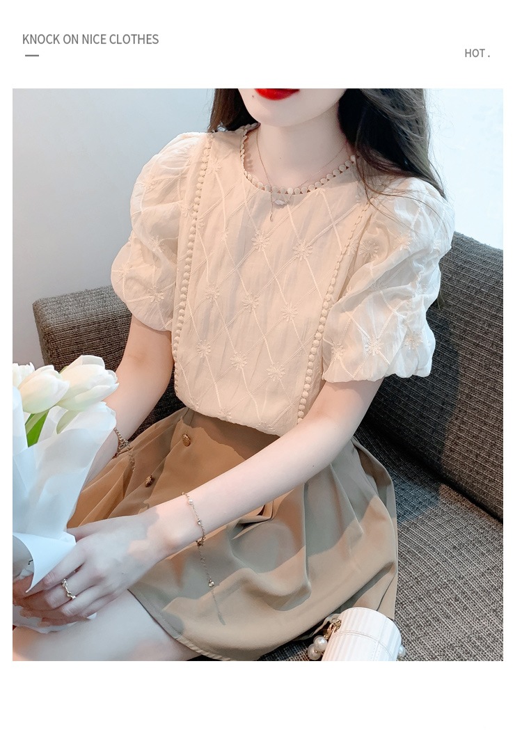 반팔 쉬폰 셔츠 여성 2025 년 여름 디자인 센스 니쉬 벨리 커버 느슨한 프렌치 퍼프 슬리브 자수 셔츠 탑스토어 가기